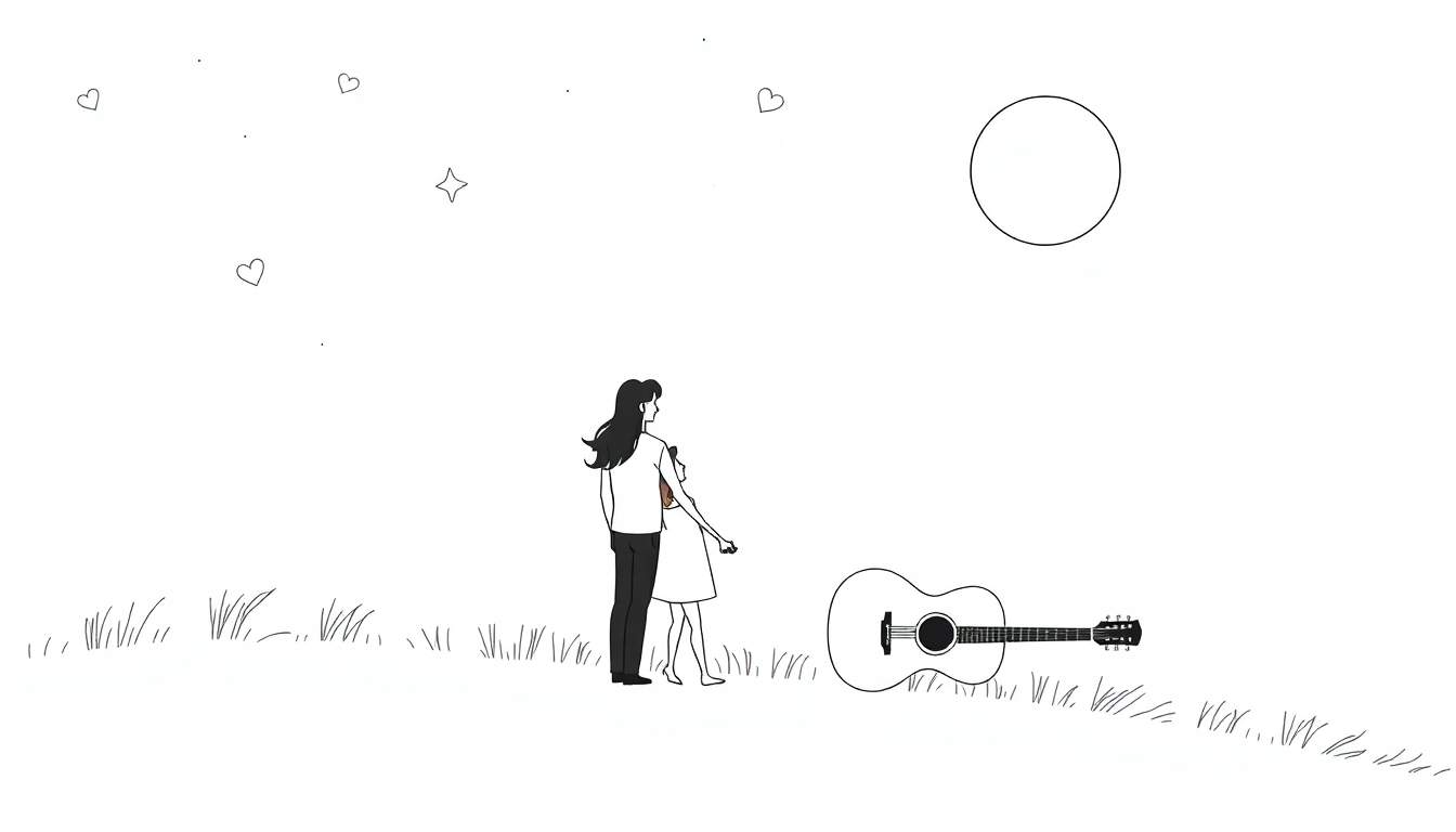Op de licht glooiende grond, bezaaid met enkele grassprieten, ligt een akoestische gitaar. Dit element voegt een muzikale ondertoon toe aan de serene scène, suggereert gedeelde passies of een moment van inspiratie. De achtergrond is leeg en wit, wat de suggestie van een uitgestrekte ruimte versterkt. Rechtsboven is een grote, lege cirkel te zien, ongetwijfeld een maan, omringd door kleine puntjes die sterren voorstellen. Drie kleine hartjes en een enkel sterretje met vier punten completeren het hemelse tafereel. De algehele sfeer is er een van rust, sereniteit en diepe verbinding, met een vleugje romantiek en contemplatie.