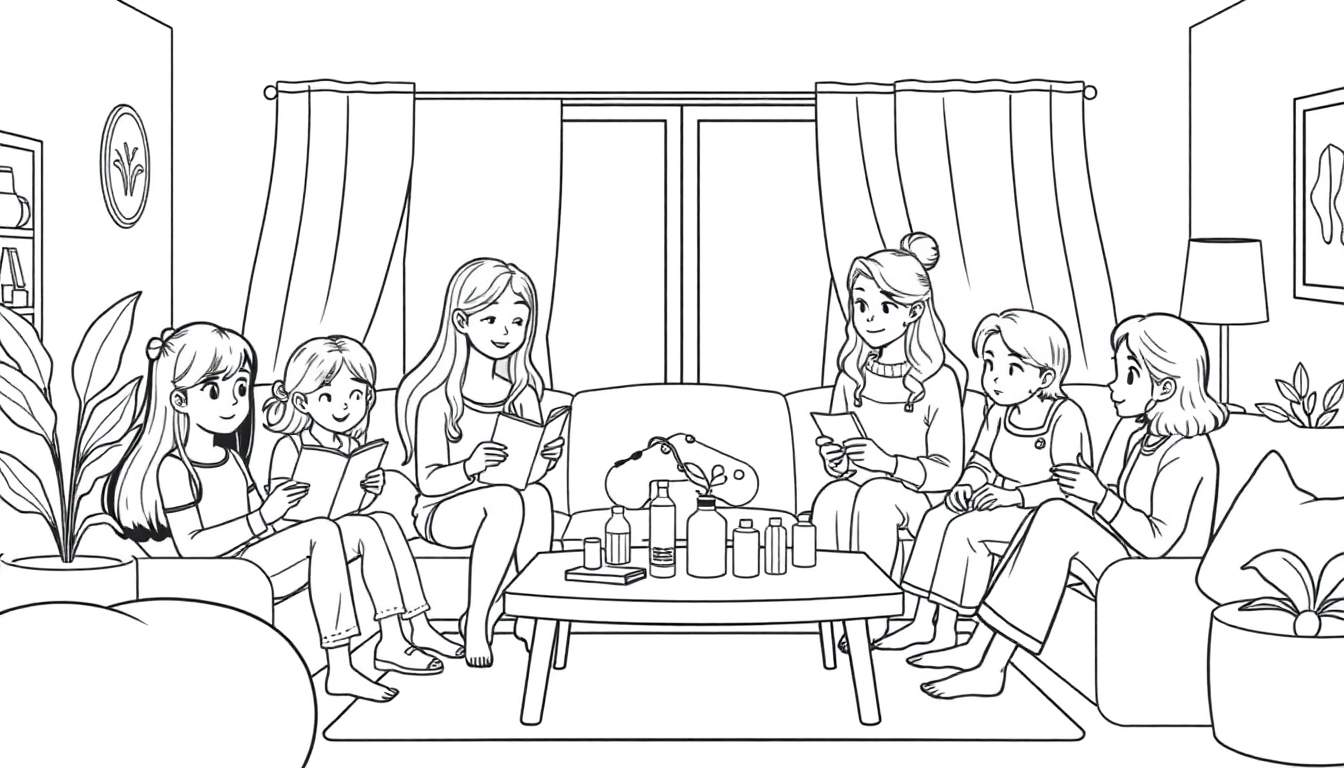 Kleurplaat van zes vrouwen die samen ontspannen in een sfeervolle woonkamer. Bezig met lezen, kletsen en huidverzorging. Inclusief details over de personen, de woonkamerinrichting met planten, kunst en meubels.