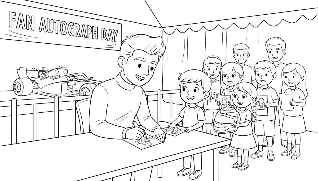 De sfeer op deze kleurplaat is er een van pure vreugde en verbondenheid. Aan de rechterkant van de scène zie je een vrolijke rij fans – zowel kinderen als volwassenen – die geduldig wachten. Ze houden diverse schatten vast: gesigneerde foto’s, blanco papieren voor die felbegeerde krabbel, en zelfs een meisje met haar eigen racehelm. Deze kleurplaat is niet zomaar een tekening; het is een ode aan de passie van Formule 1-fans en de toegankelijkheid van hun helden tijdens speciale evenementen, allemaal prachtig weergegeven onder een sfeervol afdak.