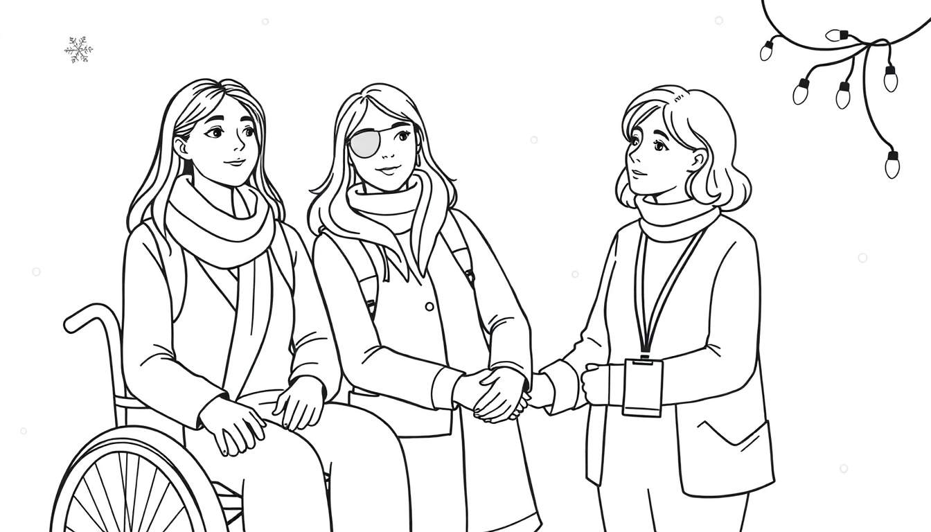 Deze kleurplaat toont een ontroerend tafereel van drie jonge vrouwen in een winterse en feestelijke sfeer. Van links naar rechts zien we een vrouw in een rolstoel, een vrouw met een ooglapje en een derde vrouw met een identificatiebadge. Ze stralen warmte, verbondenheid en steun uit door hun glimlachen en het vasthouden van elkaars hand. De achtergrond is versierd met een sneeuwvlokje en een lichtslinger, wat de feestelijke sfeer compleet maakt. Ideaal voor jong en oud om in te kleuren!