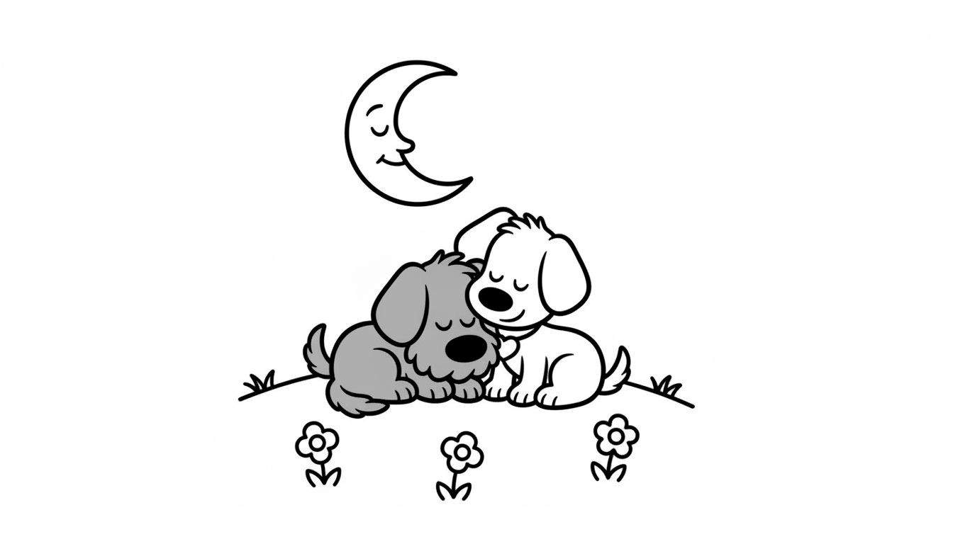 Boven de slapende hondjes waakt een vriendelijke halve maan met gesloten ogen, die lijkt mee te dromen of zachtjes toekijkt. Dit element voegt een magisch tintje toe aan de nachtelijke scène. Onder Woezel en Pip sieren drie eenvoudige bloemetjes de grond, wat het geheel een zachte en natuurlijke uitstraling geeft. Het inkleuren van deze plaat stimuleert niet alleen de fijne motoriek, maar ook de creativiteit en het gevoel voor kleur van kinderen.