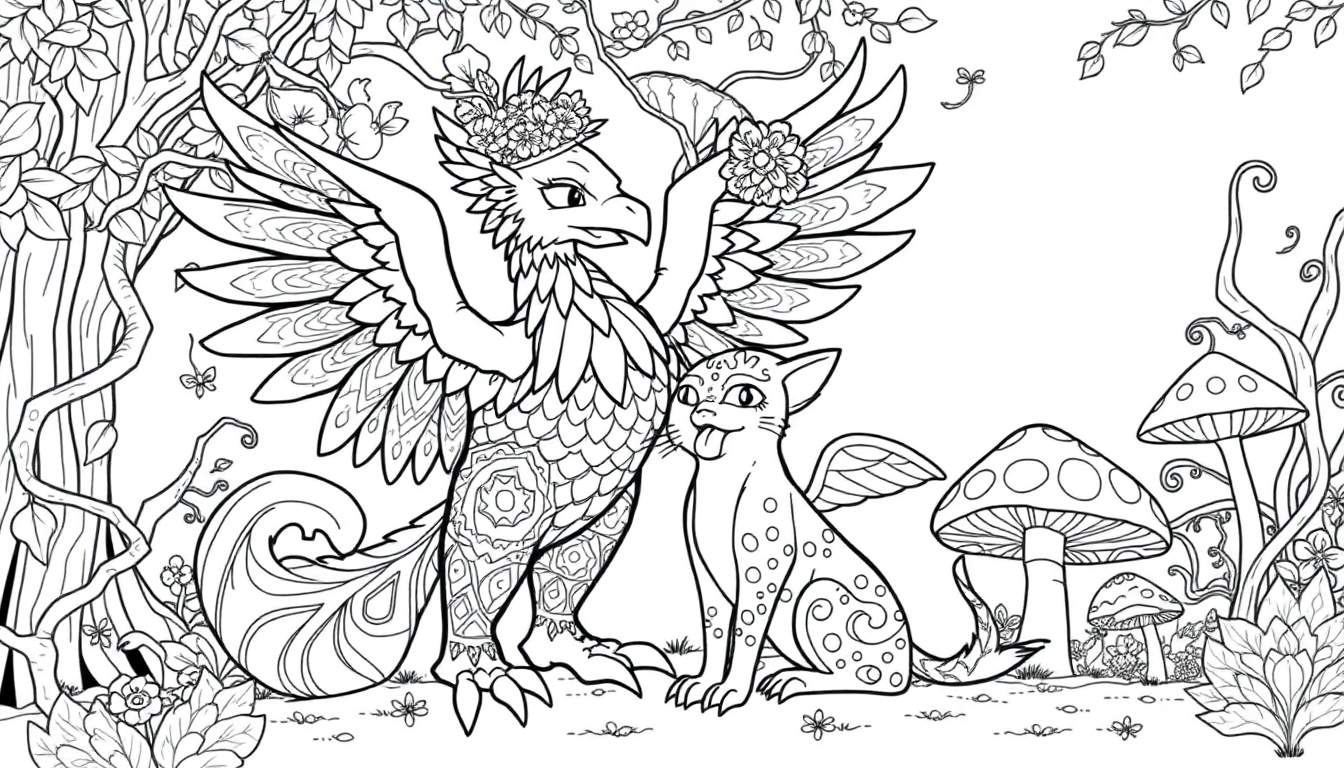 Duik in een wereld van betovering met deze prachtige zwart-wit kleurplaat. Centraal staat een majestueus wezen, dat doet denken aan een griffioen of hippogrief, met indrukwekkende vleugels en een hoofd versierd met een bloemenkroon. Zijn lichaam is rijk aan details, versierd met complexe, mandala-achtige patronen en hij houdt fier een bloem vast in zijn klauw. Naast hem, aan de rechterkant, zit een charmante, kleine metgezel: een kat-achtig figuur met kleine vleugeltjes. Met zijn gestippelde vacht, krullerige versieringen en speelse uitgestoken tong, voegt deze kleine vriend een vleugje vrolijkheid toe aan de scène.