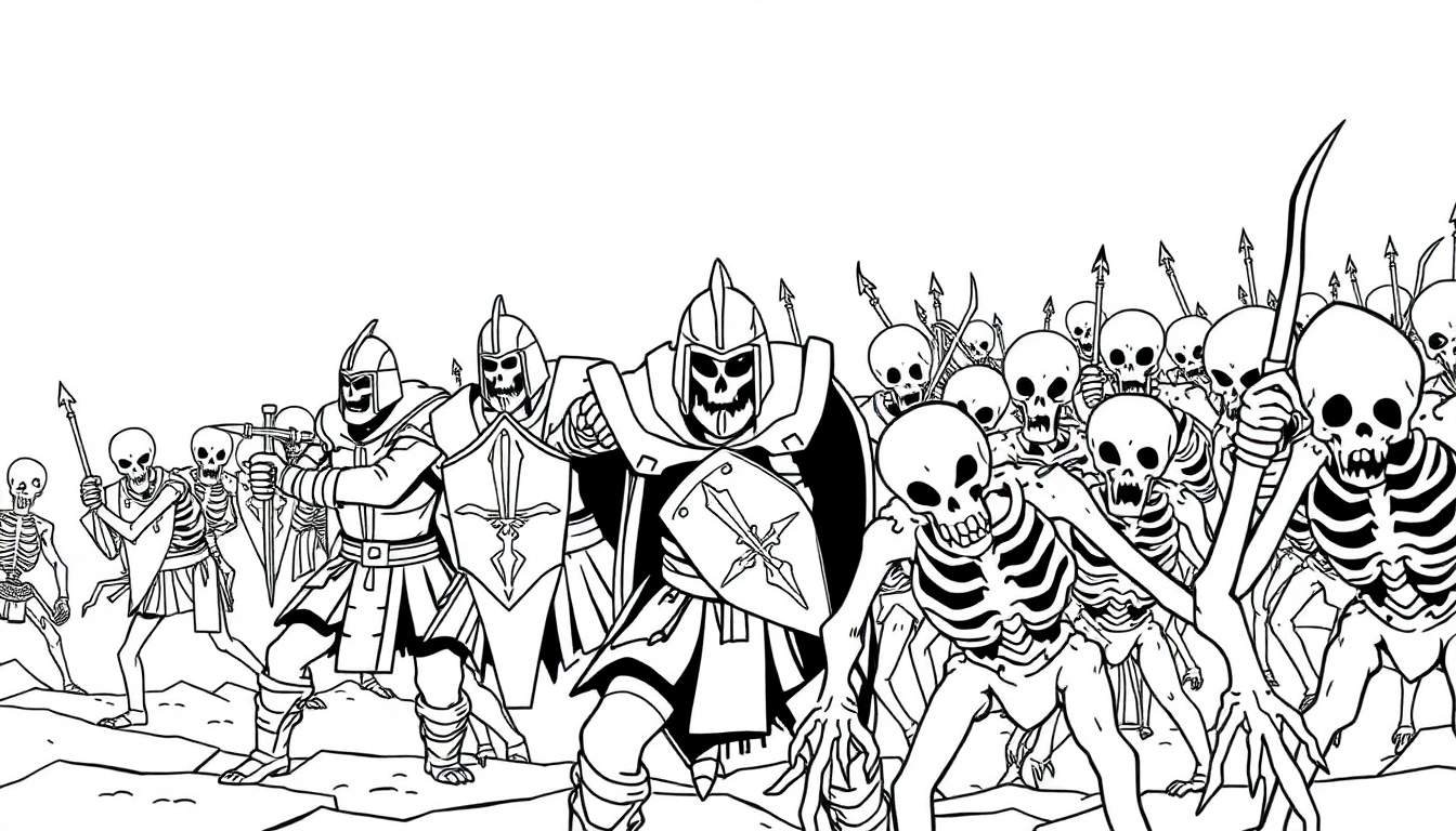 Ontdek deze spannende zwart-witte kleurplaat met een epische fantasy-scène. Grijp je kleurpotloden en breng een dreigend leger van skeletten, geleid door stoere, gepantserde krijgers, tot leven. Perfect voor creatieve avonturiers van alle leeftijden!