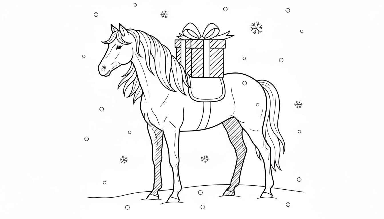 Een Magische Winterse Rit: Kleurplaat van een Paard met Cadeau