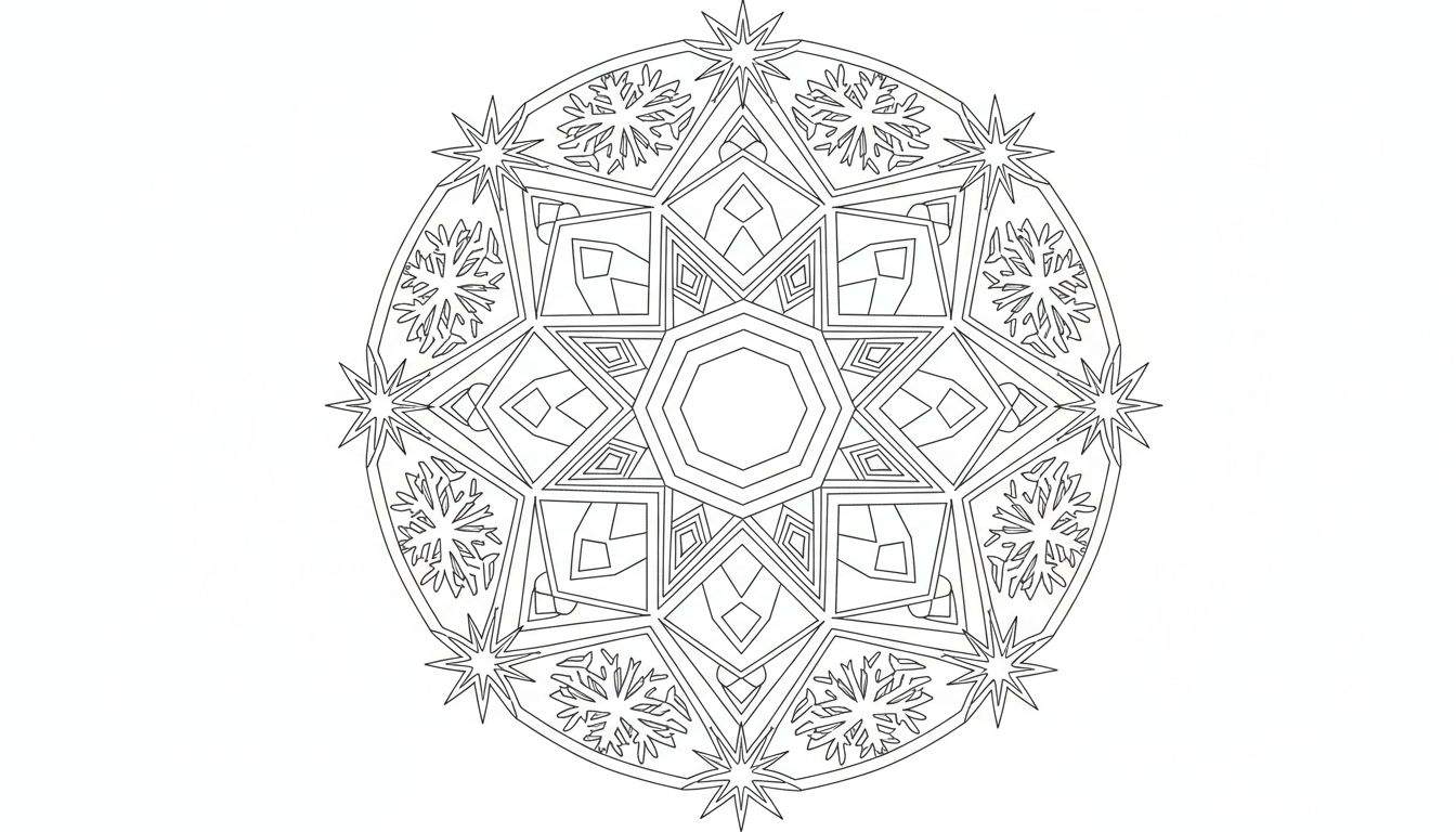 Download deze gedetailleerde, symmetrische kleurplaat die een cirkelvormig ontwerp onthult met een achthoek in het midden, omgeven door geometrische patronen, puntige stervormen en fijne sneeuwvlokdetails. Perfect voor urenlang creatief plezier!
