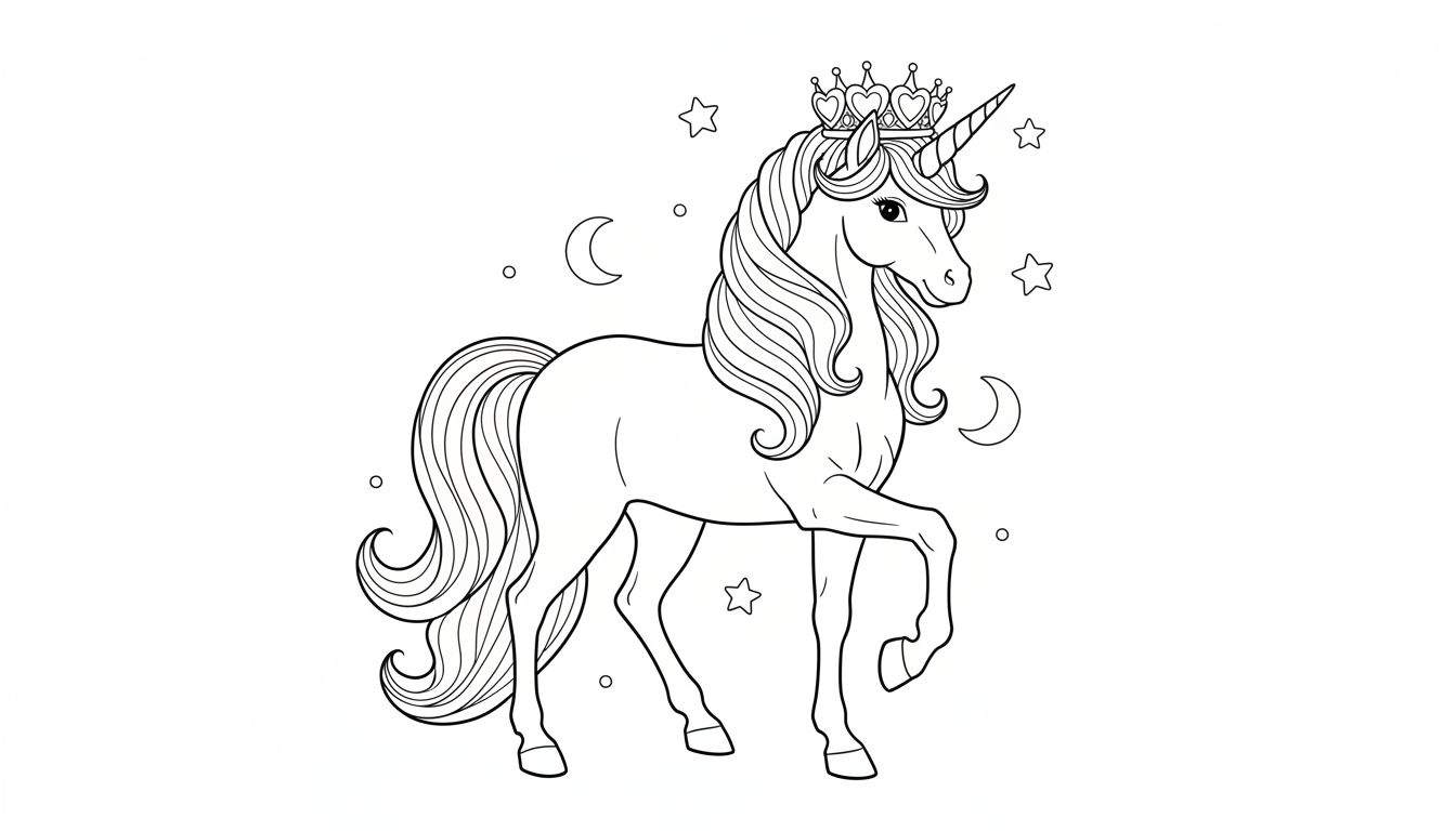 Ontdek deze betoverende zwart-wit lijntekening van een elegante eenhoorn met een fonkelende kroon, omringd door sterren en halve manen. Perfect als kleurplaat voor jong en oud om een magische wereld tot leven te brengen met verf of potloden.