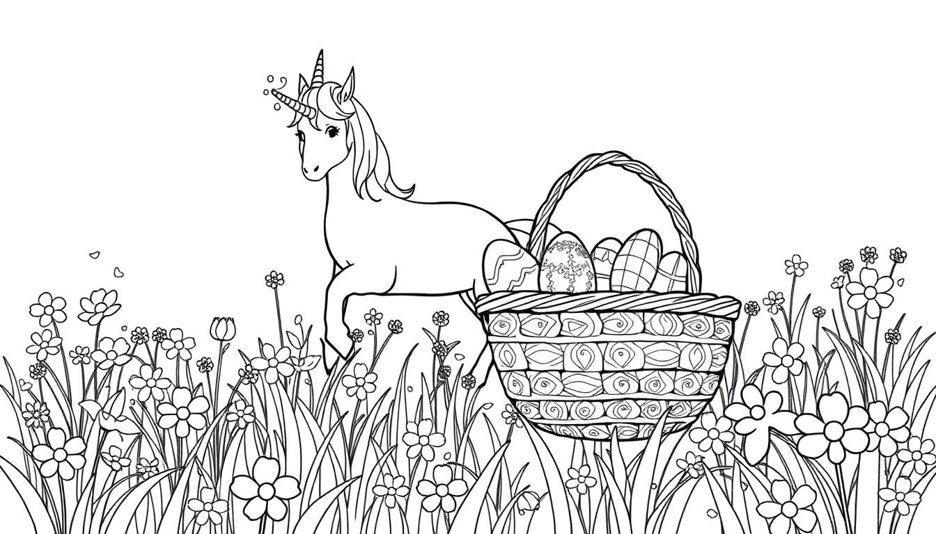 Gratis Kleurplaat: Magische Eenhoorn met Paasmand vol Eieren