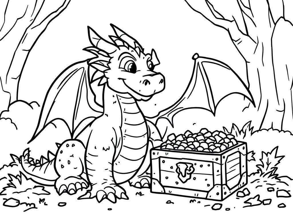 Ga op avontuur met deze vrolijke draak en zijn schatkist! Geef hem een kleurrijke huid, vul de schatkist met sprankelende tinten en laat dit magische bos tot leven komen. Welke kleuren gebruik jij om deze scène te laten stralen?