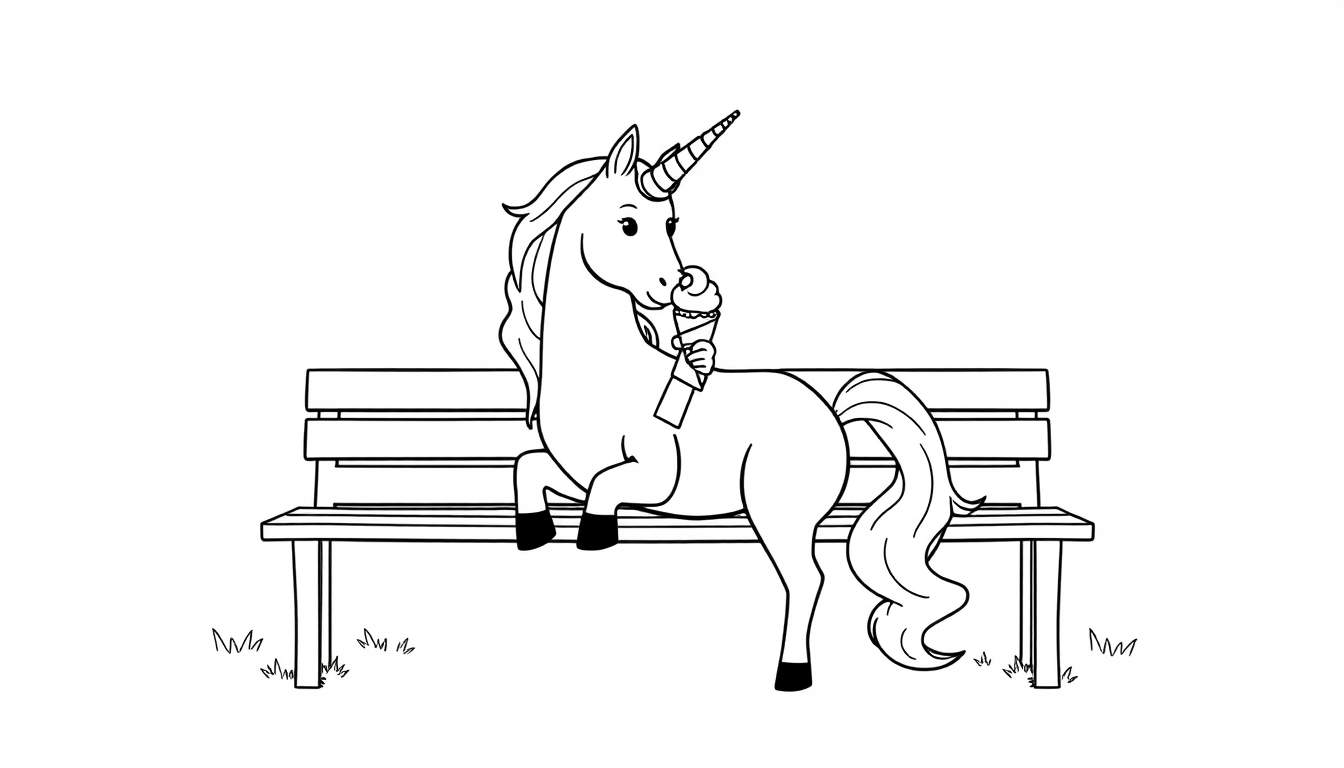 Een vrolijke zwart-wit lijntekening van een eenhoorn die ontspannen op een parkbankje zit en geniet van een heerlijk ijshoorntje. Perfect om in te kleuren!