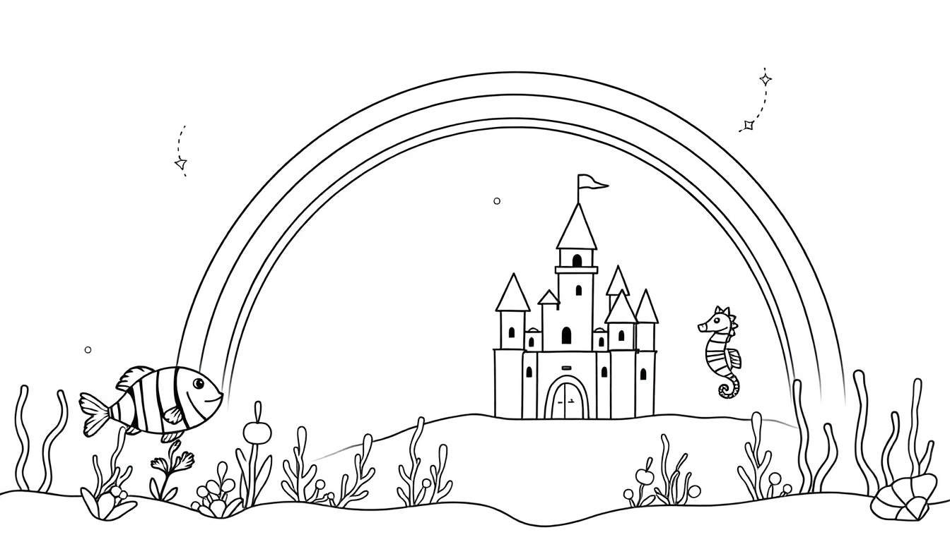 Een vrolijke zwart-wit kleurplaat van een betoverende onderwaterwereld. De tekening toont een sprookjesachtig kasteel op de zeebodem, omringd door kleurrijke waterplanten, zeewier, bubbels en een schelp. Bovenin strekt een regenboog zich uit, met sterretjes en fonkelingen aan de zijkanten. Een gestreepte vis en een gestreept zeepaardje zwemmen rond in deze fantasievolle oceaan. Ideaal voor uren kleurplezier!