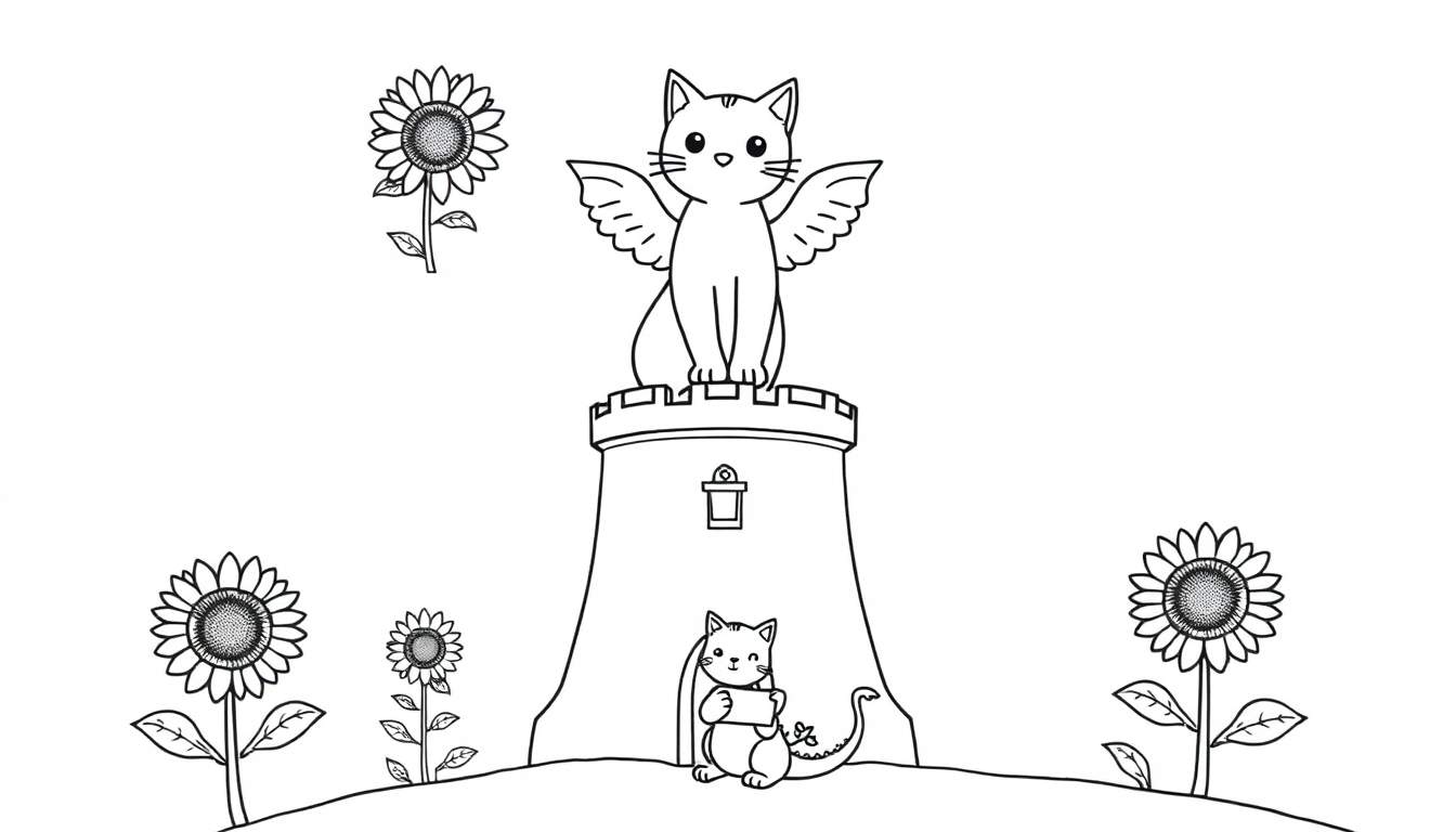 Een charmante zwart-witte lijntekening kleurplaat van een fantasietoren met kantelen. Bovenop de toren zit een gevleugelde kat met een blije uitdrukking, terwijl een andere kat met een knipoog en een leeg bordje aan de voet van de toren zit. De scène wordt omringd door vrolijke zonnebloemen op een glooiende ondergrond, perfect voor creatieve inkleuring.
