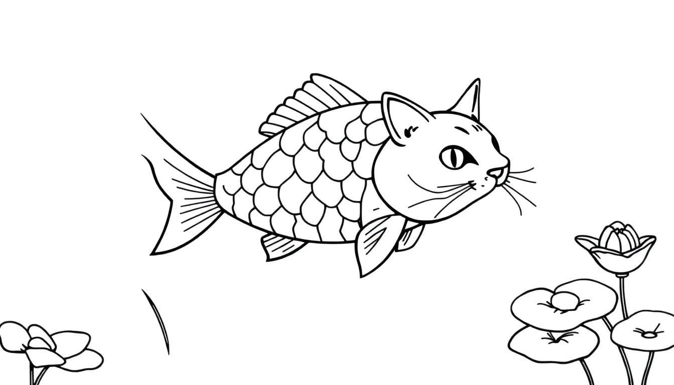 Stap in een wereld van fantasie met deze betoverende kleurplaat! We stellen je voor aan een uniek wezen dat de elegantie van een vis combineert met de speelsheid van een kat. Dit wezen, met zijn schubben, vinnen, staart en het vertrouwde kattengezicht met puntige oren, snorharen en een glimmend kattenoog, drijft rustig in het midden van de afbeelding. Omringd door zorgvuldig getekende, gestileerde bloemen aan de linkerkant en weelderige waterplanten, waaronder een bloemknop en waterleliebladeren, aan de rechterkant, biedt deze zwart-wit tekening een perfect canvas voor jouw artistieke talenten.