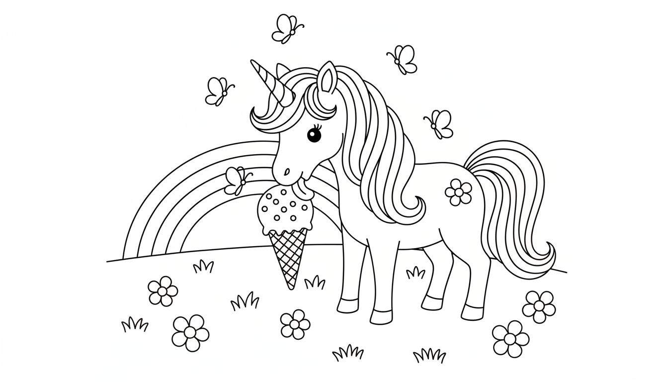 Deze vrolijke kleurplaat toont een schattige eenhoorn met een gedraaide hoorn en weelderige manen, die geniet van een ijshoorntje met stippen. Op de flank prijkt een bloem. De eenhoorn staat in een kleurrijk grasveld, met een regenboog en vliegende vlinders op de achtergrond. Perfect voor uren creatief plezier!