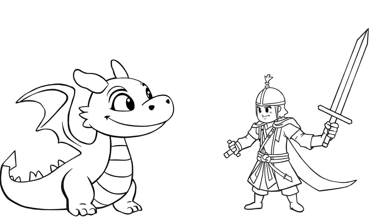 Een leuke zwart-wit kleurplaat met een schattige cartoon-draak aan de linkerkant en een jonge krijger met zwaard aan de rechterkant, klaar voor een avontuur. Ideaal om creativiteit te stimuleren!