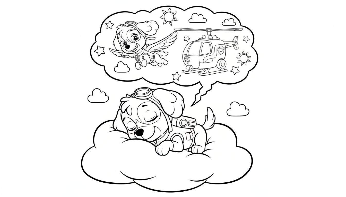 Ontdek deze betoverende Paw Patrol kleurplaat van Skye, de dappere Cockapoo! Skye ligt heerlijk te slapen op een zachte wolk, compleet met haar vliegbril op en een glimlach op haar snoet. Boven haar zweeft een fantasievolle gedachtewolk, vol met haar dromen. Hierin zie je een gevleugelde Skye vrolijk vliegen tussen de sterren en wolkjes, terwijl aan de andere kant een stoere helikopter verschijnt naast een stralende zon. Een perfecte zwart-wit lijntekening voor kinderen om in te kleuren en Skye’s avontuurlijke dromen tot leven te brengen!
