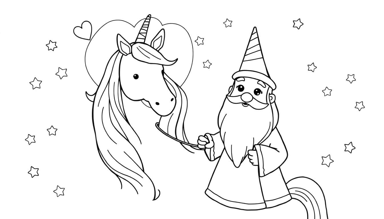 Ontdek deze betoverende zwart-wit kleurplaat met een vrolijke eenhoorn, een wijze tovenaar en zwevende sterretjes. Perfect voor urenlang creatief plezier!