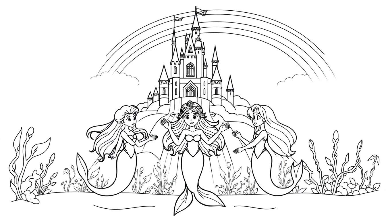 Ontdek een betoverende onderwaterwereld met deze gedetailleerde zwart-wit kleurplaat. Een sprookjeskasteel torent boven drie vrolijke zeemeerminnen uit, omringd door een levendig koraalrif en bekroond door een stralende regenboog. Perfect voor uren creatief plezier!