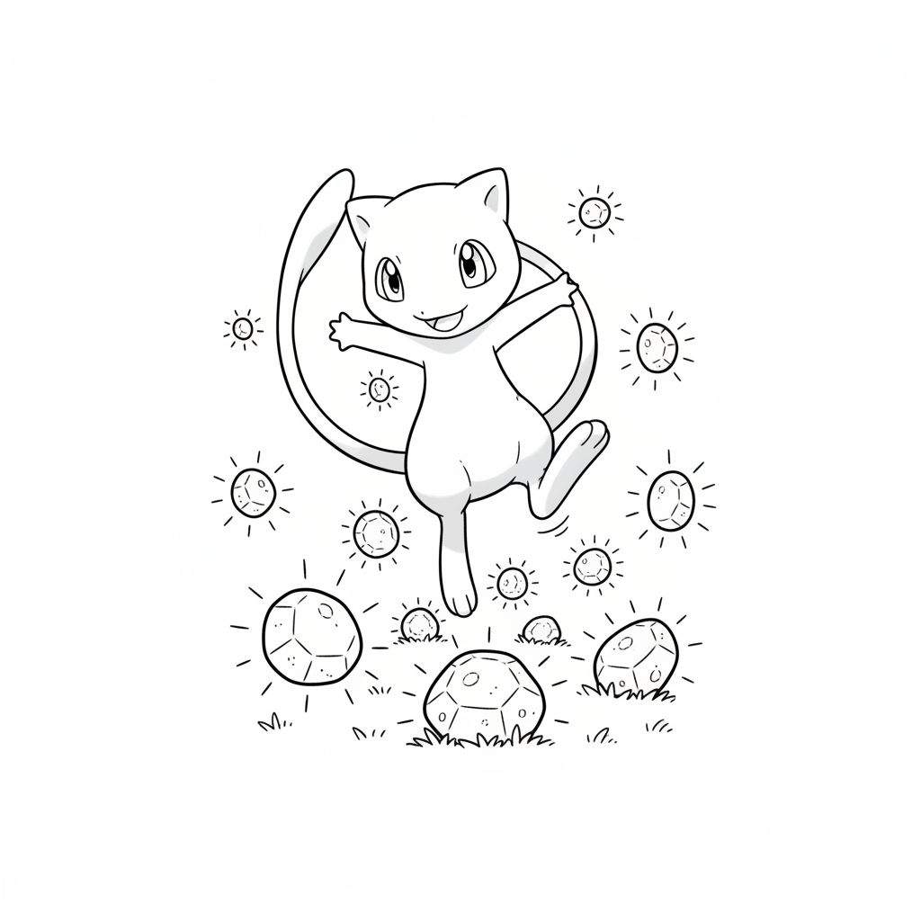 Een energieke zwart-wit kleurplaat van Pokémon Mew, vrolijk en speels afgebeeld met gespreide armen en een brede glimlach. Mew is omgeven door gloeiende energiebollen en rust op een ondergrond van gefacetteerde, lichtgevende stenen en graspolletjes, wat een levendige sfeer creëert en uitnodigt tot inkleuren.