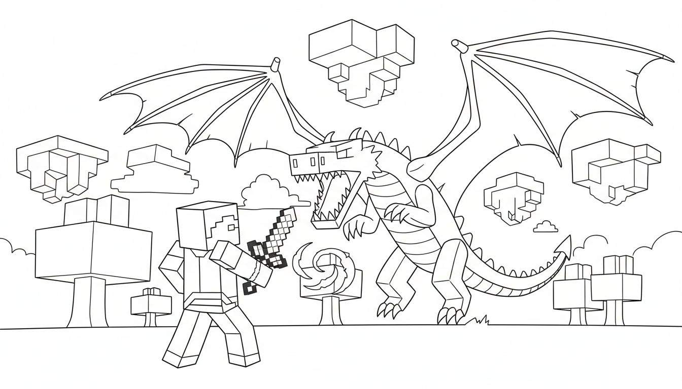 Gratis downloadbare kleurplaat van Minecraft met Steve die strijdt tegen de iconische Enderdraak. Perfect voor jonge fans om hun creativiteit te uiten in de bekende geblokte stijl.