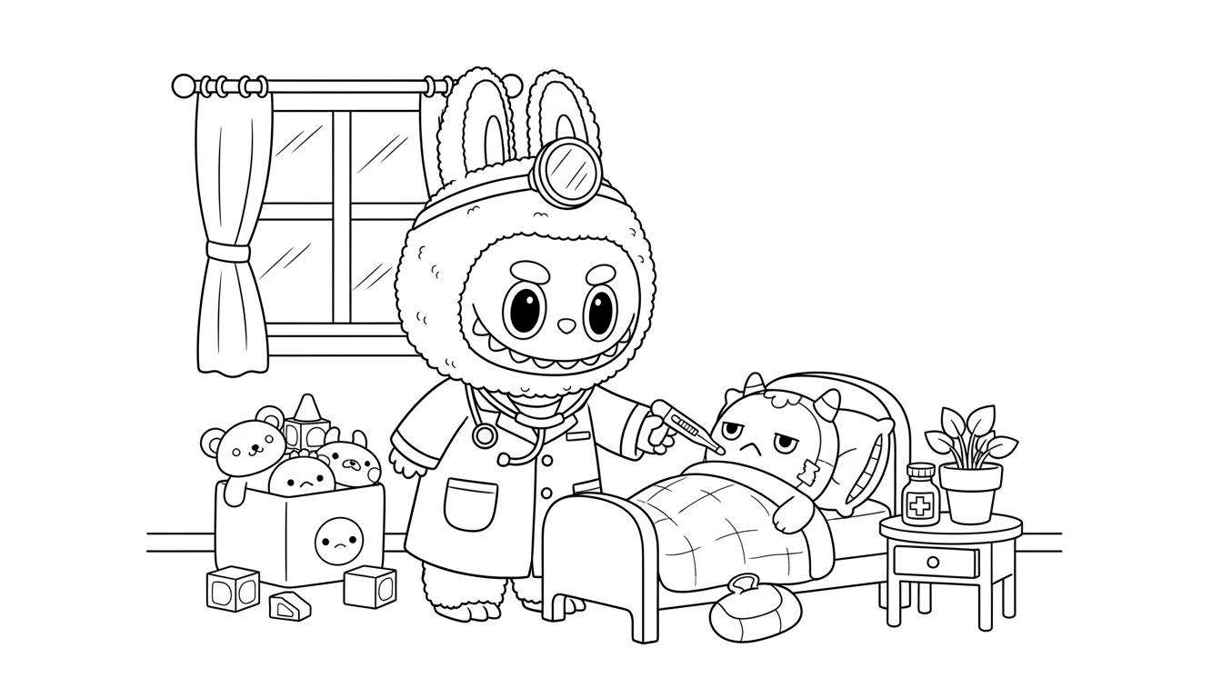 Kleurplaat Zorgzame Konijn Dokter Bezoekt Ziek Monster Labubu | Kinderen & Fantasie