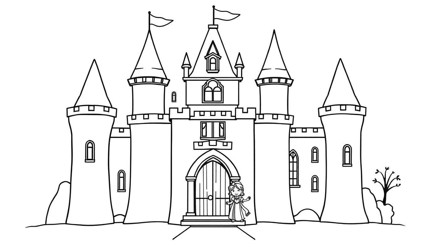 Een prachtige zwart-witte lijntekening van een sprookjesachtig kasteel met een vriendelijke prinses ervoor. Perfect voor kinderen om in te kleuren en hun fantasie de vrije loop te laten.