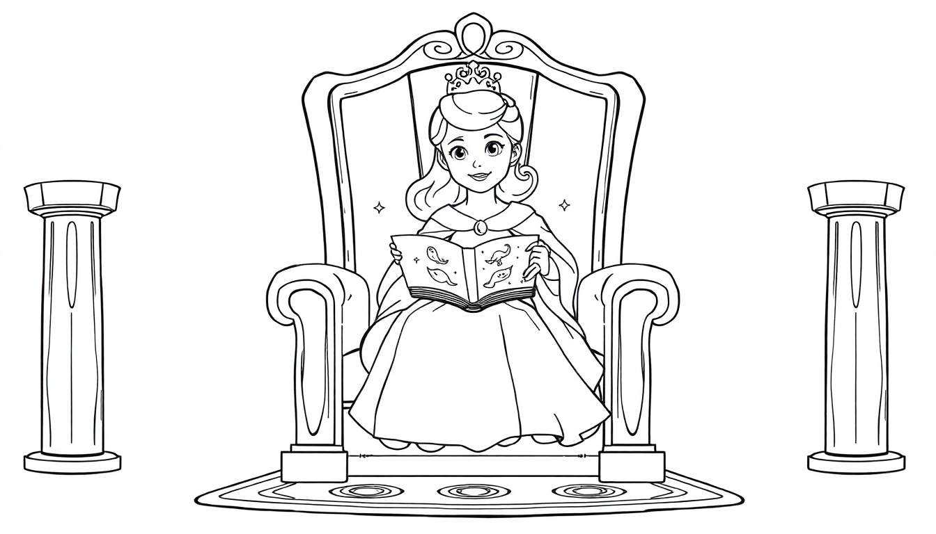 Kleurplaat van een jonge prinses die glimlachend zit op een versierde troon. Ze leest in een open boek met simpele illustraties, omringd door sterretjes. De troon staat op een verhoging met een patroonkleed en geflankeerd door klassieke pilaren.