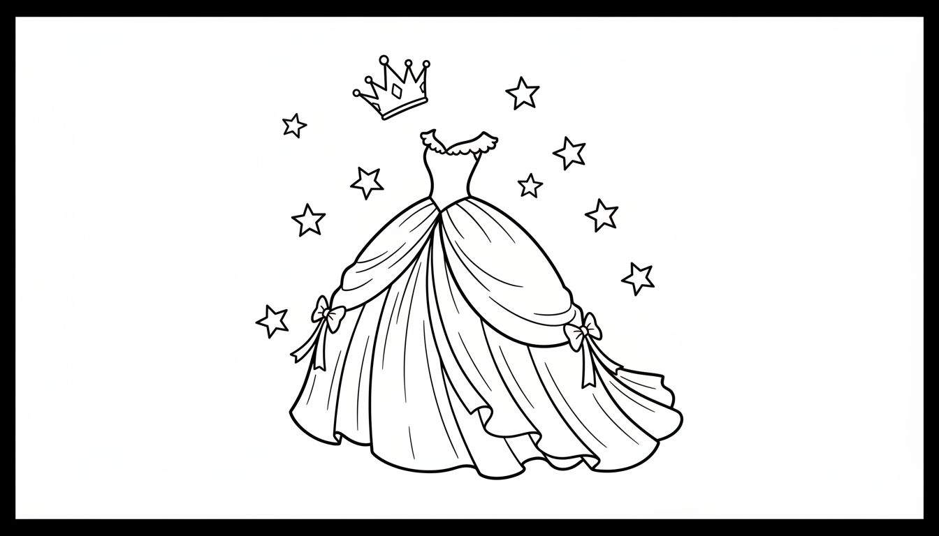 Een betoverende zwart-wit lijntekening van een prinsessenjurk met een glinsterende kroon en fonkelende sterren, perfect om tot leven te brengen met kleur. Ideaal voor creatieve kinderen die dromen van koninklijke avonturen.
