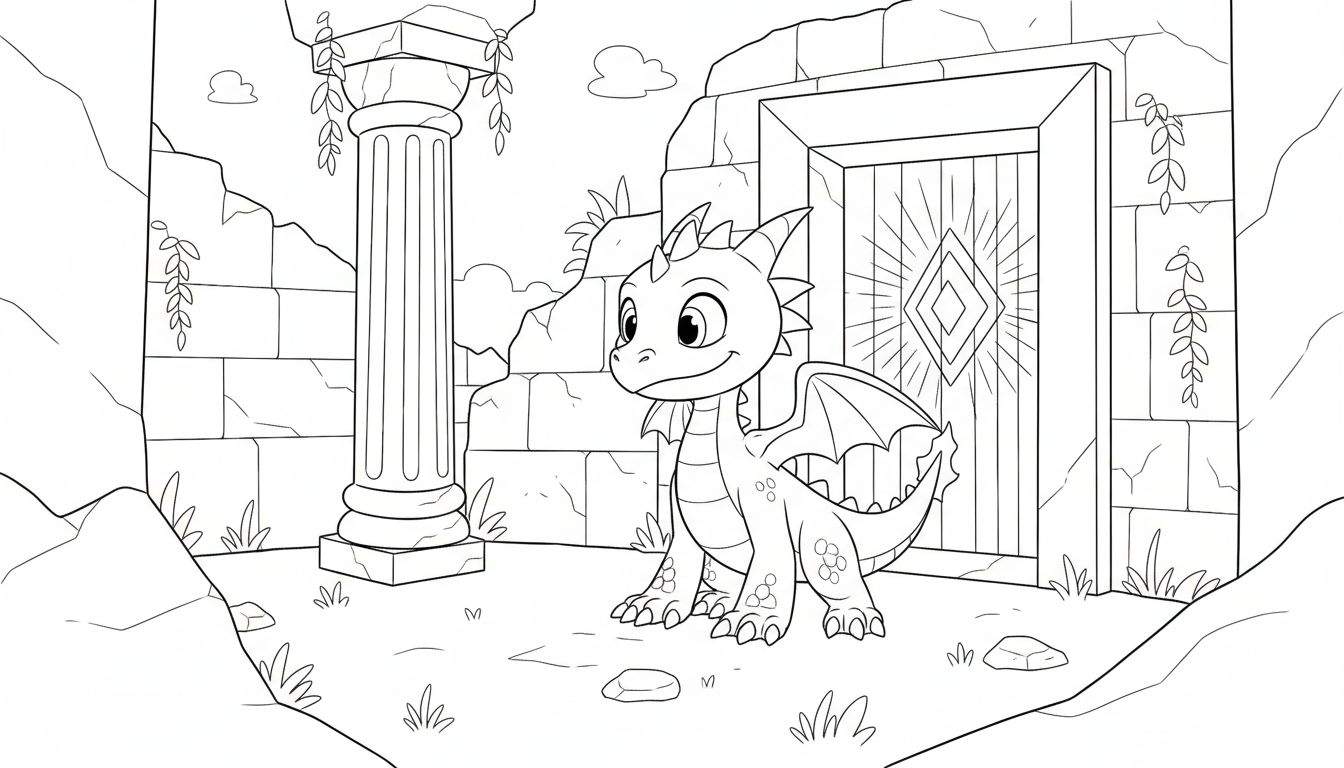Wist je dat draken in veel culturen symbool staan voor kracht en wijsheid? In sommige legendes bewaken ze schatten, terwijl ze in andere verhalen juist beschermers zijn. Misschien is dit kleine draakje wel de bewaker van de poort die naar een land vol magie leidt! Je kunt je voorstellen dat de ranken aan de muur niet zomaar planten zijn, maar betoverde klimop die de geheimen van de ruïnes fluistert. Misschien kom je erachter wat er achter die magische deur schuilt zodra je de kleurplaat afmaakt!