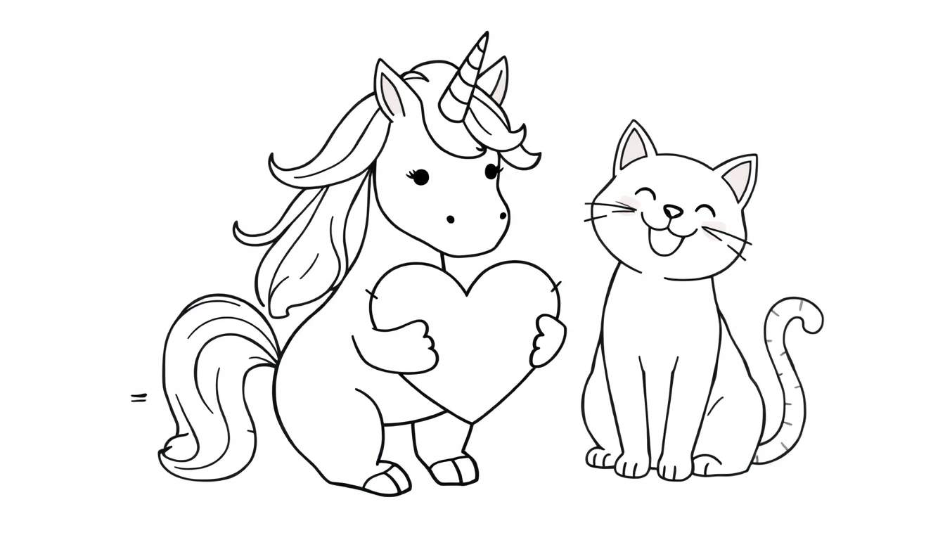 Aan de rechterkant zit de kat, die met een stralende lach naar de eenhoorn kijkt. De gesloten ogen en het zichtbare puntje van de tong versterken het gevoel van immense blijdschap en opwinding. De kat, compleet met speelse snorharen en een zwierige, gekrulde staart, lijkt de aanbieding van het hart met open armen te ontvangen. De blanco achtergrond benadrukt de interactie tussen de twee dieren en nodigt uit om met levendige kleuren tot leven te worden gebracht.