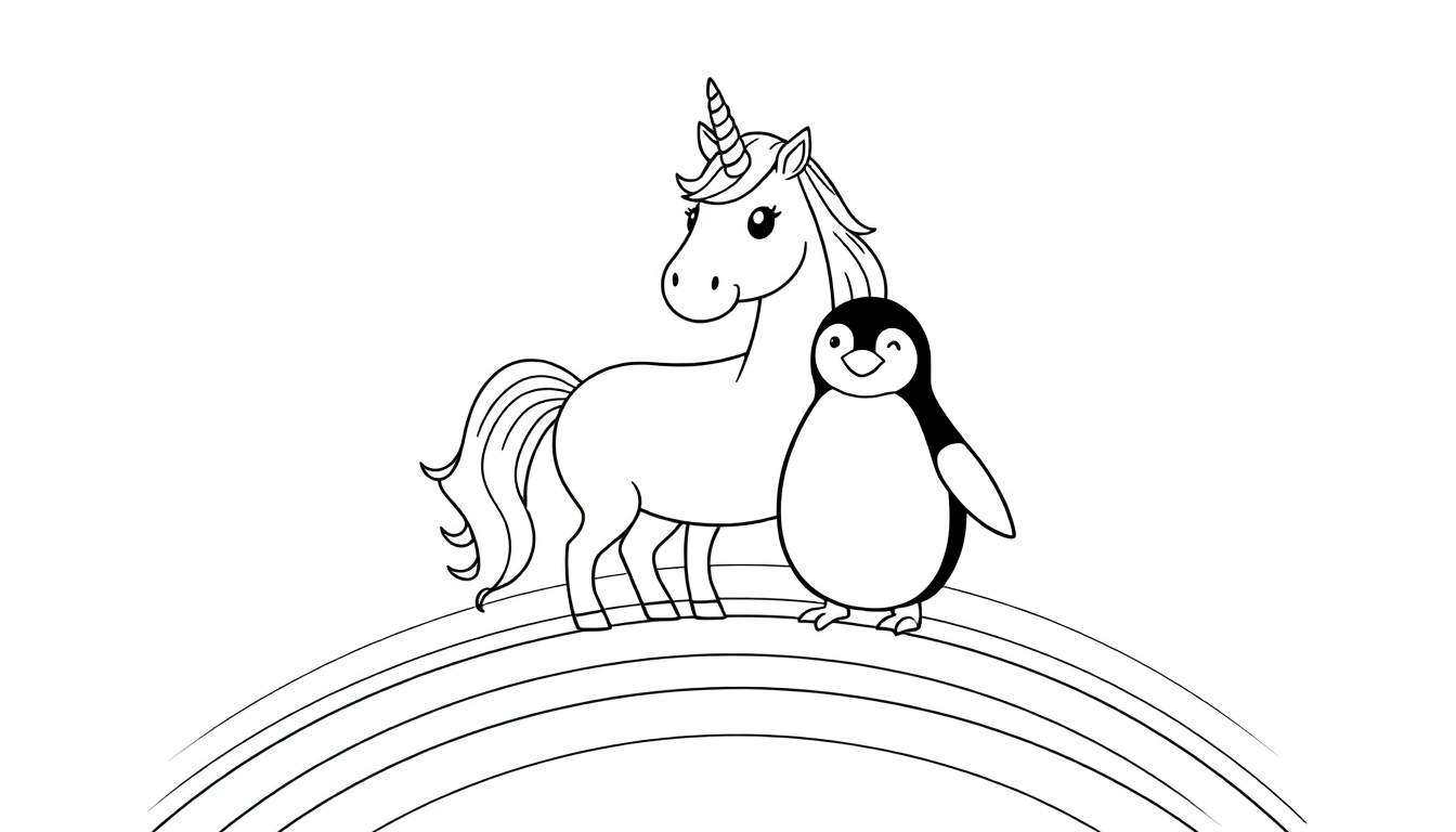 Gratis zwart-wit lijntekening van een lieve eenhoorn en een knipoogende pinguïn die samen op een vrolijke regenboog staan. Perfect om in te kleuren!