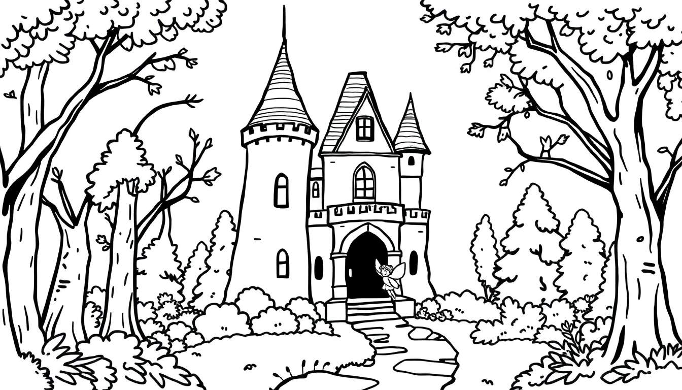 Een gedetailleerde zwart-wit lijntekening van een betoverend sprookjeskasteel omringd door een weelderig bos, compleet met torens, een brug en een zwevende fee. Perfect om creativiteit de vrije loop te laten.