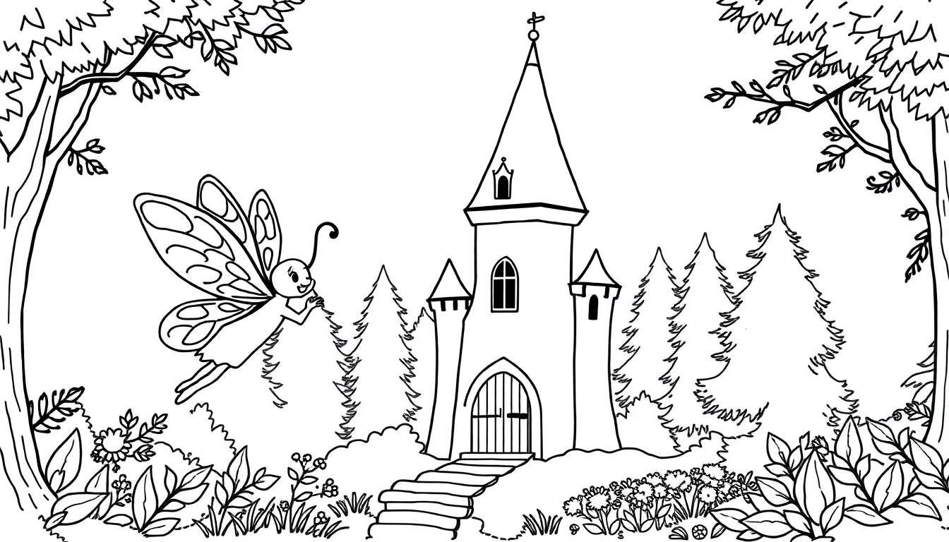 Een betoverende zwart-wit kleurplaat met een sprookjesachtig kasteel, een vriendelijke vlinderfee en een weelderig bos vol details. Perfect voor uren kleurplezier!