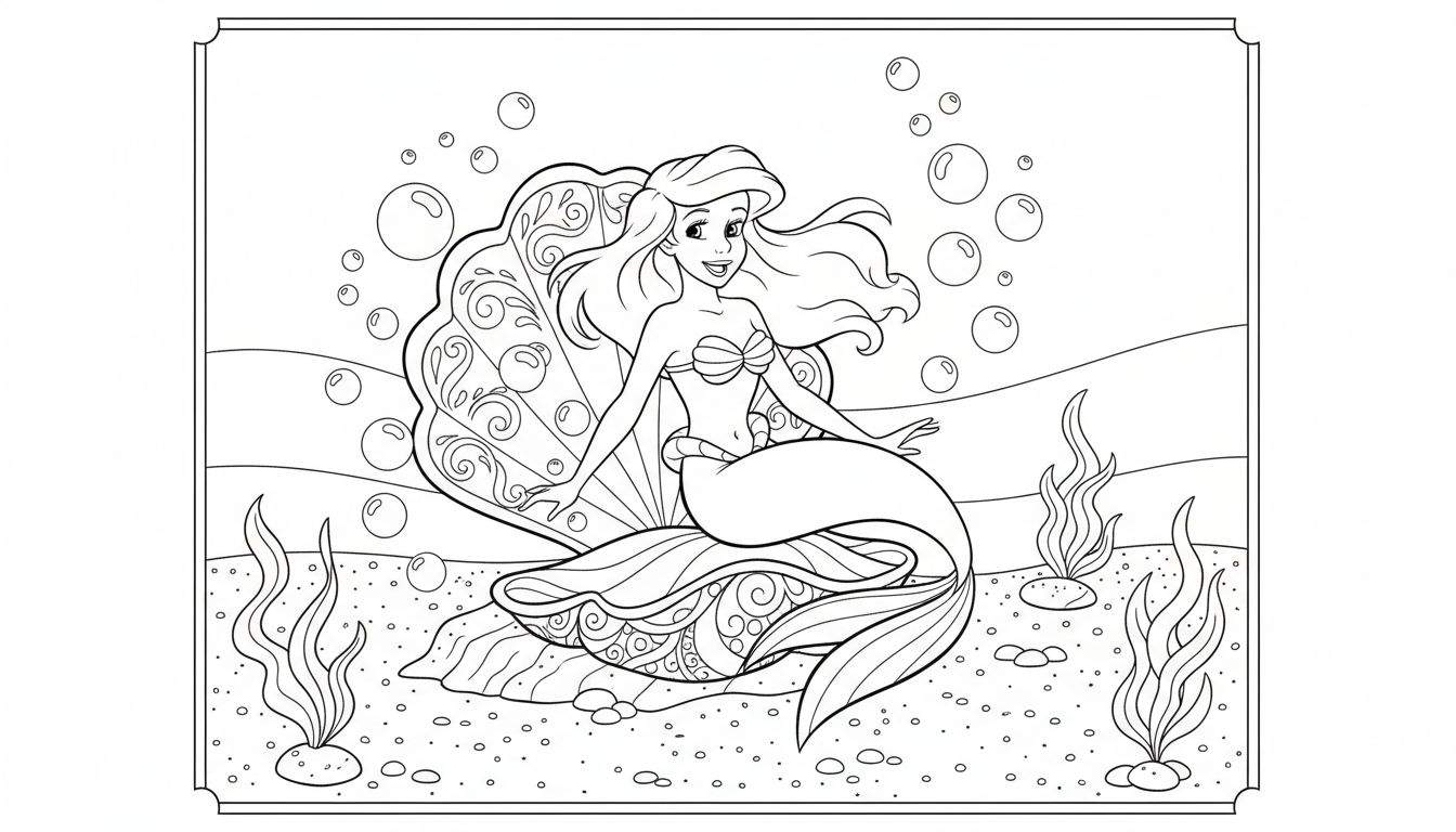 Laat je fantasie de vrije loop met deze prachtige zwart-wit kleurplaat, perfect voor alle leeftijden. In het hart van deze onderwaterwereld vind je een stralende zeemeermin, gezegend met lang, golvend haar en een beha gemaakt van glinsterende schelpen. Haar vriendelijke glimlach nodigt je uit om haar wereld tot leven te brengen met jouw favoriete kleuren. Ze rust in een imposante, open schelp, versierd met ingewikkelde krulpatronen die een koninklijke uitstraling geven. De omgeving is levendig met talloze luchtbellen van verschillende groottes die speels om haar heen zweven, alsof ze uit de diepte opstijgen. De zeebodem is gedetailleerd met fijn zand en kleine steentjes, aangevuld met charmante plukjes zeewier en waterplanten die het oceaanlandschap compleet maken. De hele kunstwerk is omhuld door een elegante, rechthoekige rand, klaar om ingekleurd te worden en je eigen unieke stempel erop te drukken.