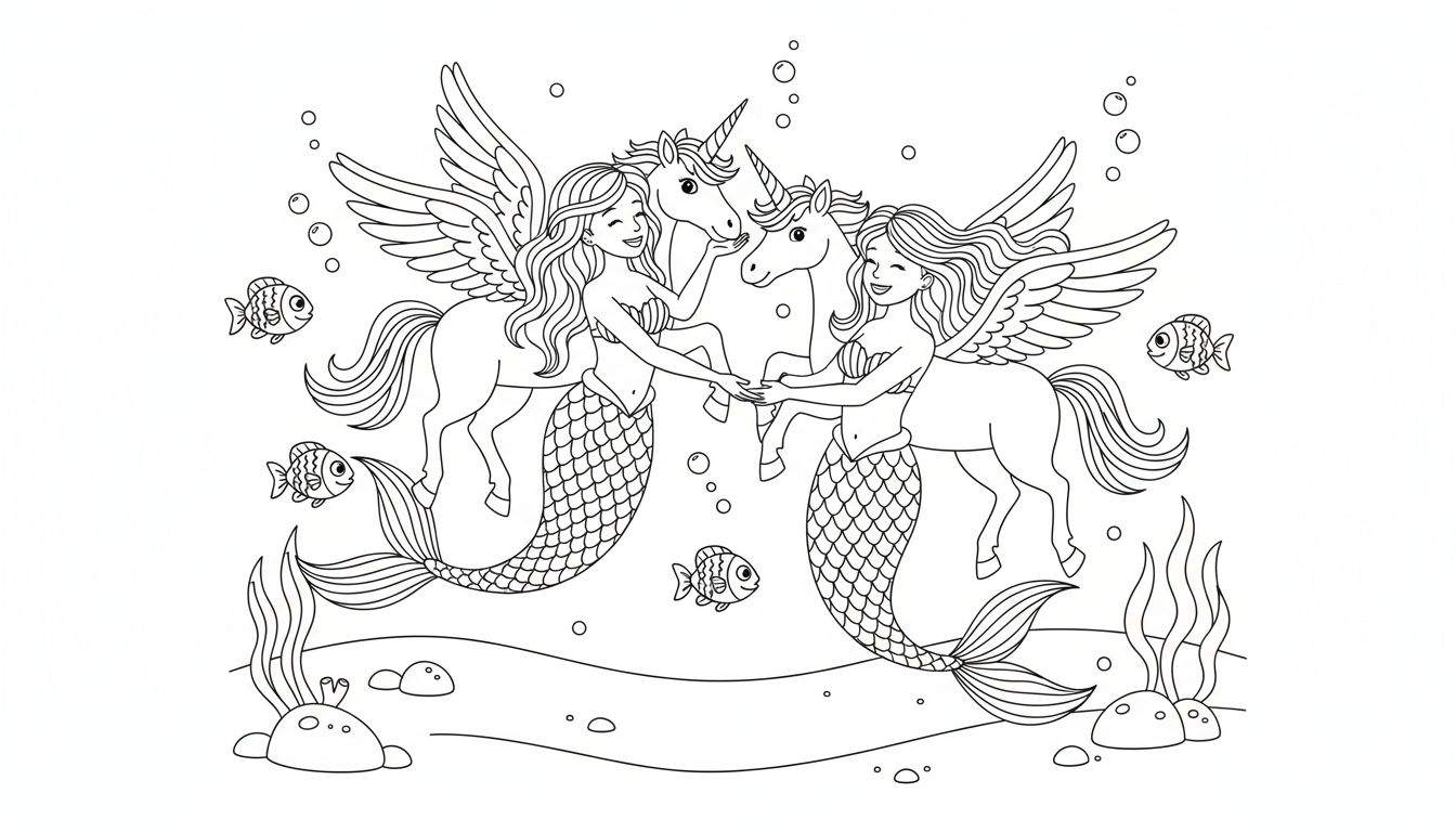 Een magische zwart-witte lijntekening van een onderwaterscène met twee zeemeerminnen met vleugels en twee gevleugelde eenhoorns. Perfect om in te kleuren en de fantasie te prikkelen!