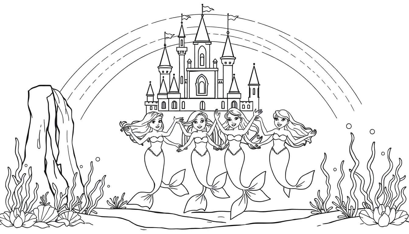 Een betoverende kleurplaat met een sprookjeskasteel boven een levendige onderwaterwereld. Dansende zeemeerminnen, kleurrijke zeewier, schelpen en zwevende luchtbellen creëren een magische scène.