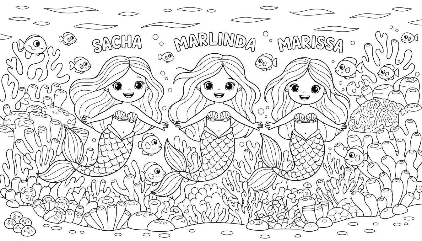 Een gedetailleerde zwart-wit kleurplaat met drie lachende zeemeerminnen genaamd Sacha, Marlinda en Marissa. Ze bevinden zich in een levendige onderwaterwereld vol met kleurrijk koraal, zeewier, kleine visjes, schelpen en steentjes. Perfect voor creatieve kinderen die dol zijn op zeemeerminnen en de oceaan.