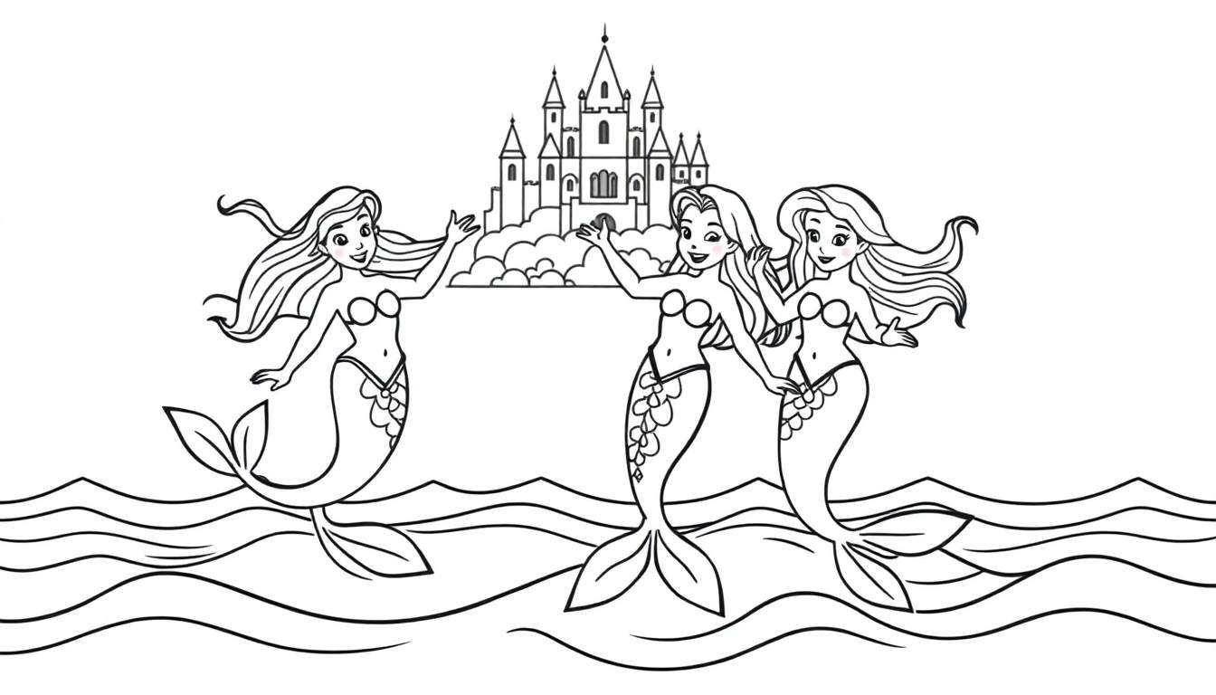 Gratis downloadbare zwart-wit kleurplaat met drie lachende zeemeerminnen die zwaaien, met een sprookjeskasteel op de achtergrond en golven. Perfect voor urenlang kleurplezier!
