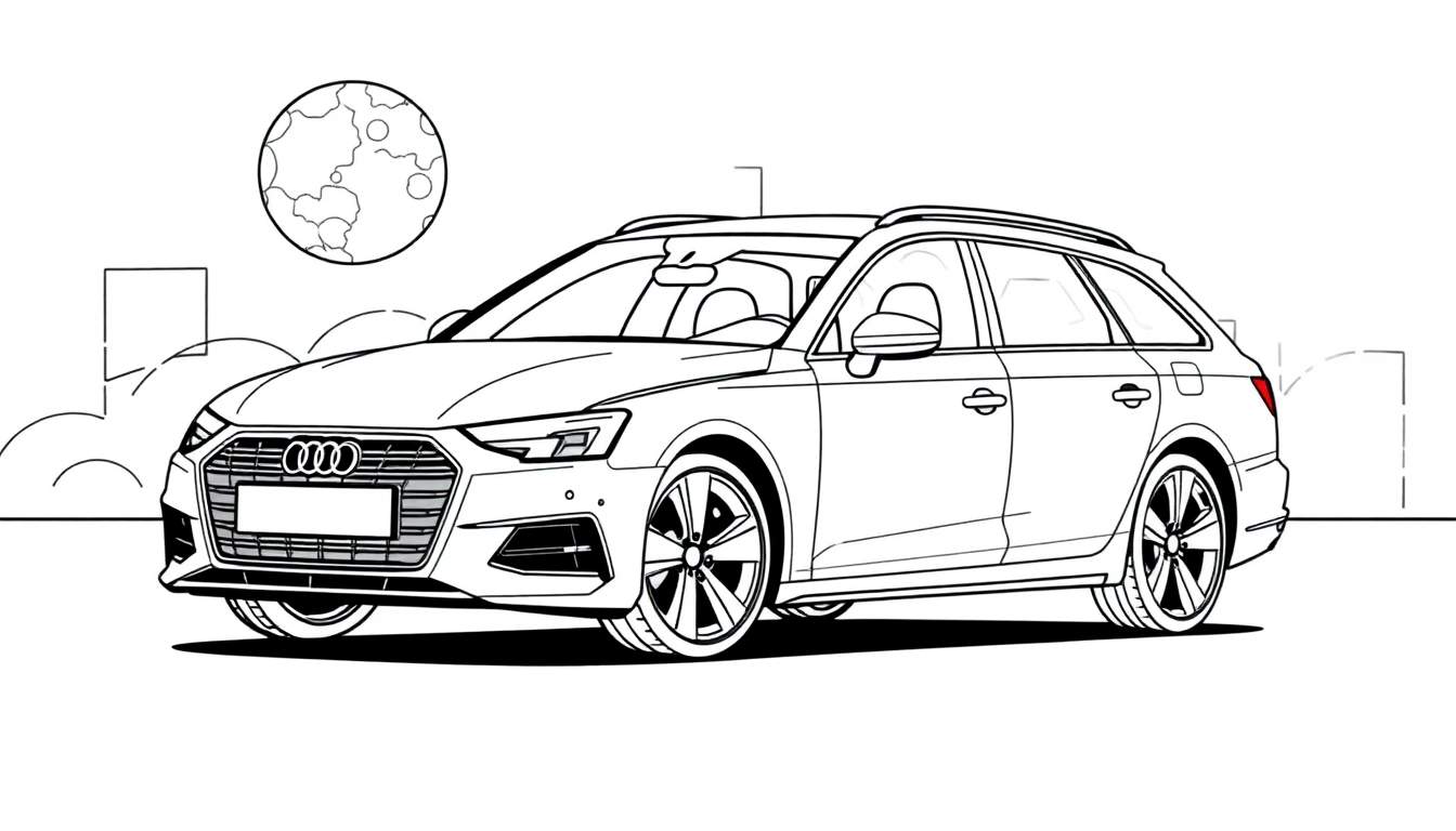 Een gedetailleerde zwart-wit lijntekening van een moderne Audi stationwagon, gezien vanuit een driekwart vooraanzicht. De kleurplaat toont de auto met kenmerkende Audi-details zoals de honingraatgrille en lichtmetalen velgen. De achtergrond is een gestileerde stedelijke skyline met abstracte gebouwcontouren en een prominente ronde maan die boven de auto uitsteekt. Ideaal voor autoliefhebbers en kinderen die van tekenen houden.