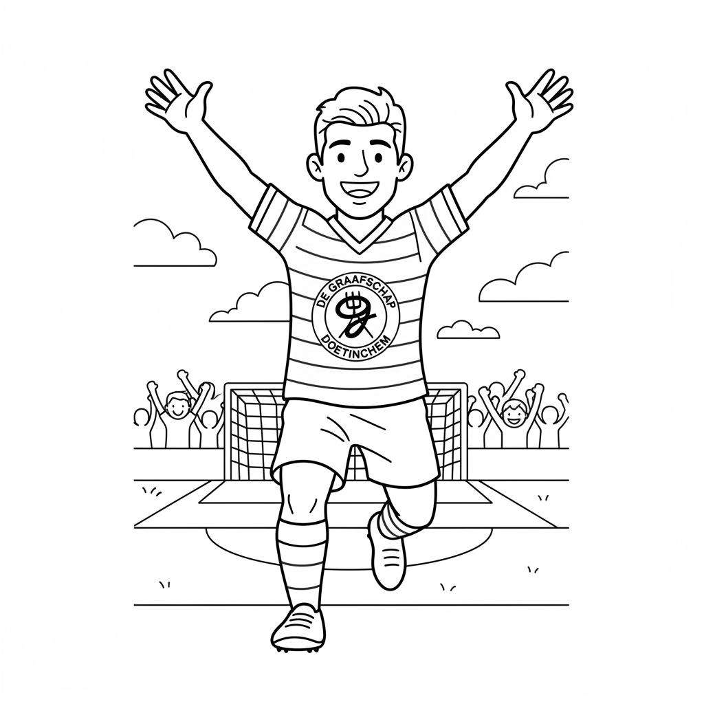 Duik in de sfeer van De Graafschap met deze unieke kleurplaat! Een jonge, juichende voetballer met een stralende glimlach viert een overwinning. Hij draagt het iconische gestreepte tenue van De Graafschap Doetinchem, compleet met logo. Achter hem zijn het doel, de lijnen van het veld en enthousiaste supporters te zien. Een perfecte kleurplaat voor jonge Superboeren en voetballiefhebbers om hun teamgeest te tonen.