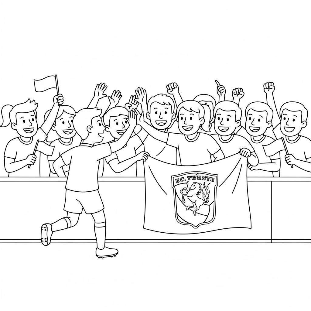 Een dynamische FC Twente kleurplaat die de pure vreugde van voetbalfans vastlegt. Dit tafereel toont een vrolijke menigte van zowel mannen als vrouwen, die vol enthousiasme hun favoriete team toejuichen vanaf de tribune, zichtbaar achter een balustrade. Centraal staat een speler of supporter in compleet tenue die een ‘high five’ geeft aan de juichende mensen. Samen met een aantal fans houden ze een imposant spandoek met “F.C. TWENTE” en het herkenbare clublogo van het steigerende paard vast. Links wappert een kleine vlag en overal zijn armen omhoog geheven in jubelende gebaren, begeleid door brede, oprechte glimlachen. De kleurplaat ademt een feestelijke en uitbundige sfeer, perfect om zelf in te kleuren en de overwinning van FC Twente te vieren.