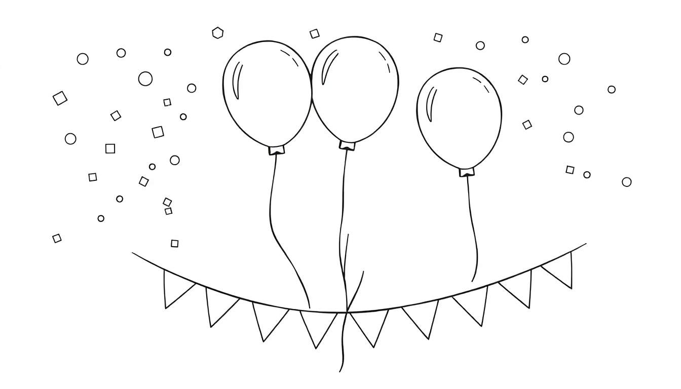 Een vrolijke zwart-wit lijntekening van drie zwevende ballonnen met touwtjes, een feestelijke vlaggenlijn en rondzwevende confetti. Perfect om in te kleuren en de feeststemming te creëren!