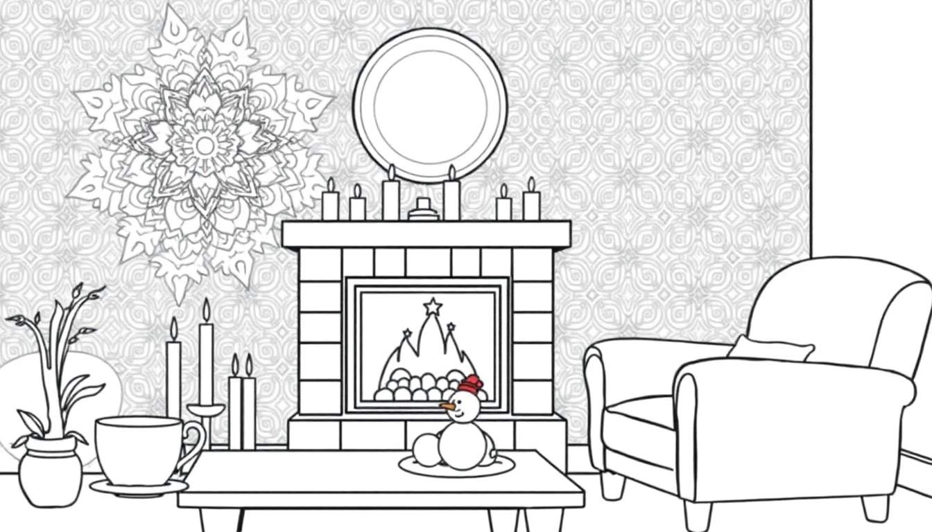 Stap in een wereld van winterse warmte met deze prachtige, gedetailleerde kleurplaat. De afbeelding toont een sfeervolle woonkamer die baadt in een feestelijke, kerstachtige ambiance. Van de subtiel versierde muren met een elegante mandala tot de centraal geplaatste, gemetselde schoorsteen, elk detail is ontworpen om je fantasie te prikkelen. Op de brede schoorsteenmantel fonkelen meerdere kaarsen naast een ronde spiegel, die het licht weerkaatst en de ruimte een extra dimensie geeft.