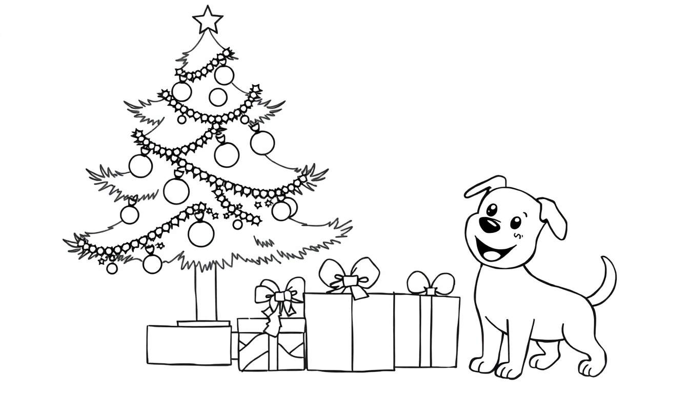 Ontdek deze vrolijke zwart-wit kleurplaat met een kerstboom vol versieringen, cadeaus en een lachende hond. Perfect voor creatieve kerstmis!