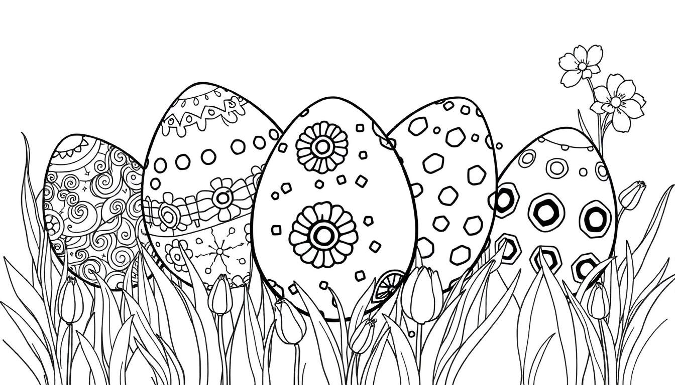 Ontdek deze gedetailleerde zwart-wit kleurplaat met een Paasthema! Geniet van vijf uniek versierde paaseieren, omringd door hoog gras en prachtige tulpen. Perfect voor creatieve uren!