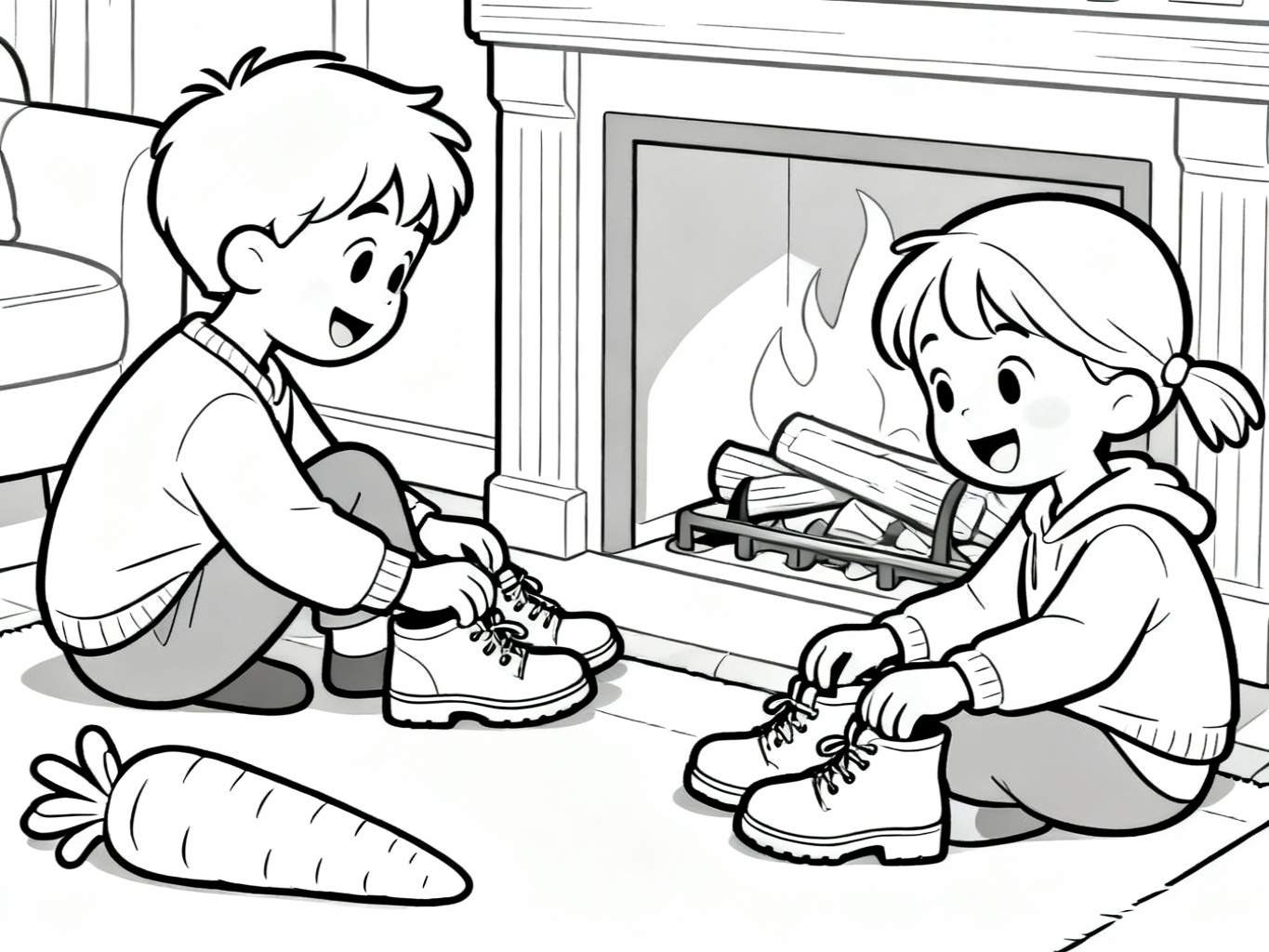 Een charmante zwart-wit kleurplaat toont twee vrolijke kinderen, een jongen en een meisje, zittend op de vloer voor een knapperende open haard. Beide lachen blij terwijl ze bezig zijn met hun schoenen, elk met twee laarsjes voor zich, wat de anticipatie op Sinterklaasavond verhoogt. De jongen draagt een gestreepte trui en een broek, terwijl het meisje een hoodie, broek en een staartje heeft. Links van de jongen ligt een grote wortel klaar, bedoeld voor het paard van Sinterklaas. De achtergrond wordt verfraaid door een klassiek gedetailleerde schouw van de open haard, waar houtblokken branden op een rooster. Links op de voorgrond is een deel van een bank of fauteuil zichtbaar, wat bijdraagt aan de gezellige, winterse sfeer van een woonkamer. Een perfecte plaat om de Sinterklaastraditie te vieren met kleur.