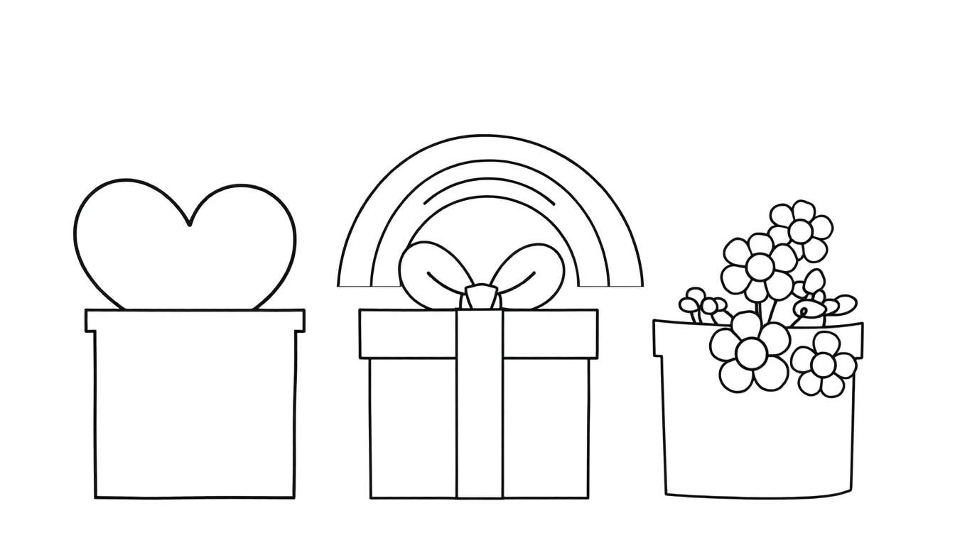 Download deze gratis lijntekening kleurplaat met drie leuke objecten: een doos met een hart, een ingepakte cadeaudoos met regenboog en een bloempot vol bloemen. Perfect voor uren creatief kleurplezier!
