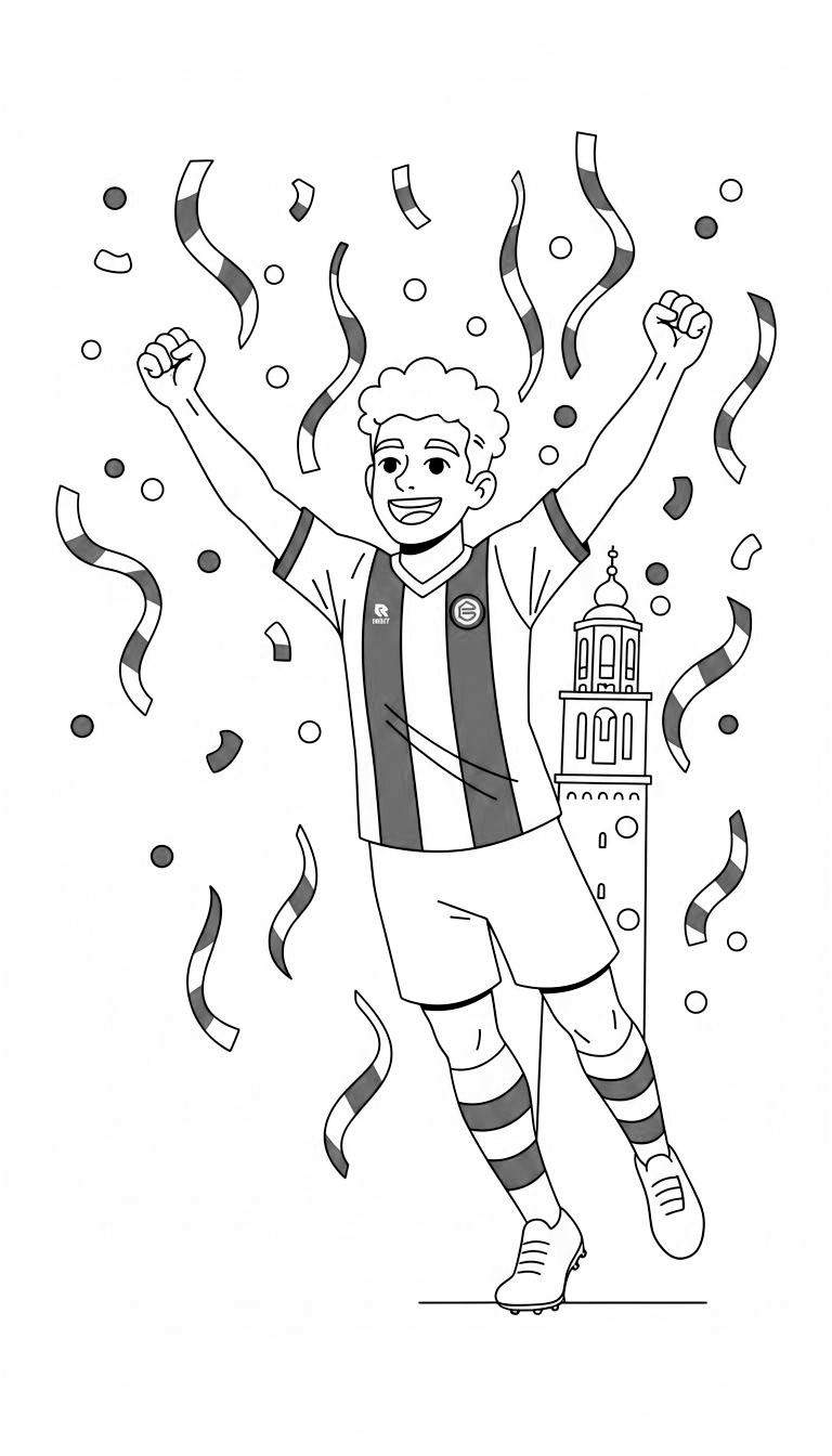 De sfeer van feest en euforie spat van het papier af. Rondom de juichende speler dwarrelen slingers, confetti en kleine cirkels, die de lucht vullen met een gevoel van festiviteit. Dit alles creëert een dynamische scène die wacht om tot leven gebracht te worden met levendige kleuren. De combinatie van de juichende speler en de feestelijke elementen maakt dit een ideale kleurplaat om creativiteit en clubliefde te uiten.