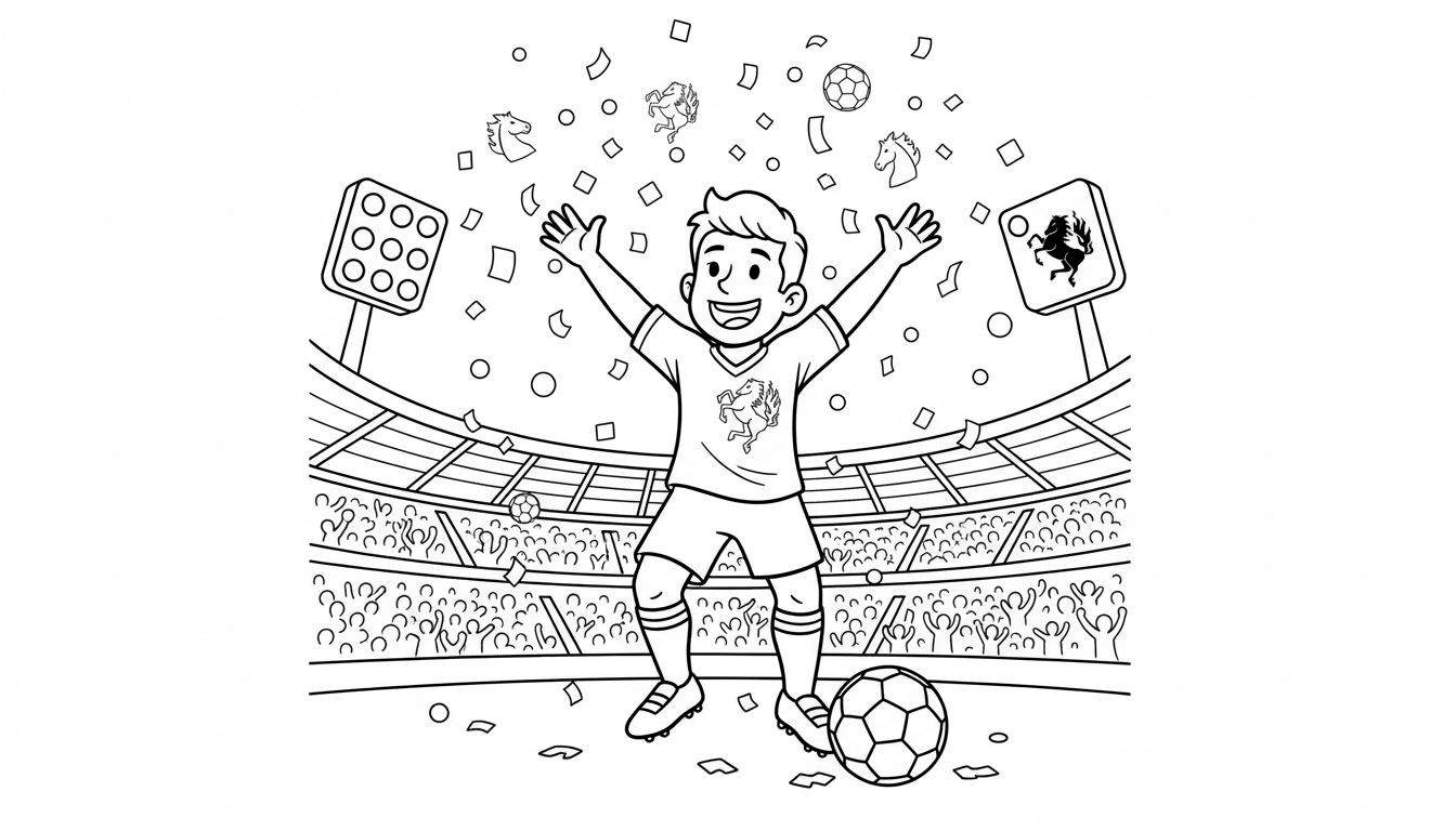 Duik in de feestvreugde met deze unieke FC Twente kleurplaat! In het midden pronkt een vrolijke voetballer, de armen triomfantelijk omhoog, een brede glimlach op zijn gezicht. Hij draagt met trots zijn clubtenue, versierd met het iconische springende paard – het symbool van kracht en snelheid, en uiteraard de mascotte van de club. De achtergrond toont een bruisend voetbalstadion, gevuld met een uitgelaten menigte die hun team toejuicht. Overal vliegen confetti, kleine voetballen en zelfs paardenfiguren door de lucht, wat de overwinningssfeer perfect weergeeft. Deze plaat is een ode aan de energie en passie van het voetbal.