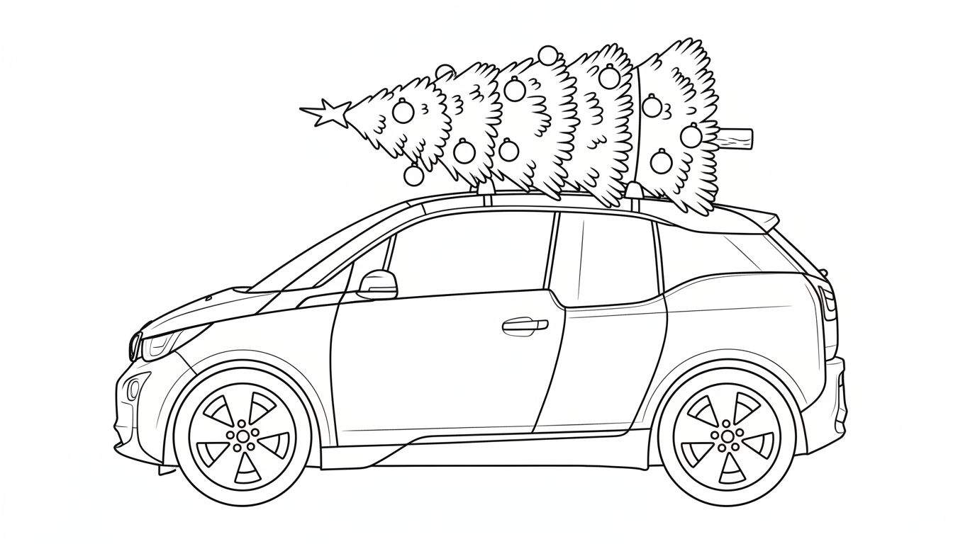 De feestdagen komen eraan en wat is er nu leuker dan je eigen creativiteit de vrije loop te laten? Met deze unieke zwart-wit kleurplaat beleef je de magie van Kerstmis van dichtbij. Je ziet een moderne, compacte auto, vast klaar om de weg op te gaan. Op het dak prijkt een weelderige kerstboom, compleet met glimmende kerstballen en een schitterende ster aan de top. De boom is stevig vastgebonden, wat suggereert dat hij net is aangeschaft en op weg naar huis is om het huis te versieren. Deze gedetailleerde lijntekening is de perfecte uitnodiging om je favoriete kleuren tevoorschijn te halen en deze scene tot leven te brengen. Ideaal voor zowel kinderen als volwassenen die even willen ontsnappen aan de hectiek van de voorbereidingen en willen genieten van een creatief moment.