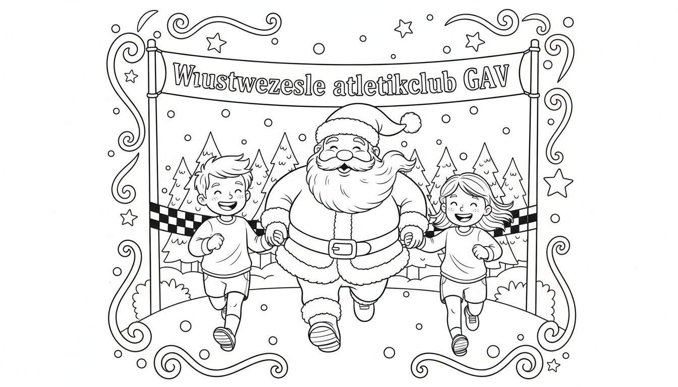 Een vrolijke zwart-wit kleurplaat van de Kerstman, een jongen en een meisje die samen lachend een finishlijn oversteken. Op de achtergrond staan kerstbomen, sneeuw en een spandoek van de Wuustwezesle atletiekclub GAV. Perfect voor de feestdagen!
